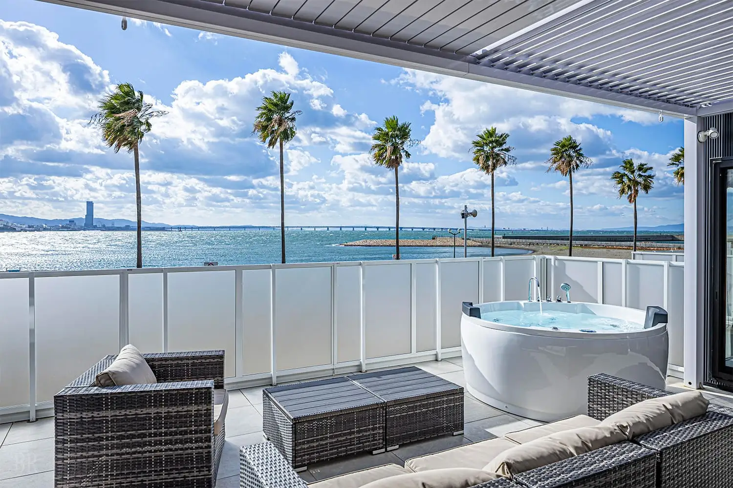 海を望むロケーションに位置する「アッパーBBQガーデン」では、日帰りBBQをお楽しみいただけます。屋根付きのBBQスペースには、ゆったりと寛げるソファ席を配置。目の前に広がるオーシャンビューを眺めながら、プライベート感のある時間をお過ごしいただけます。