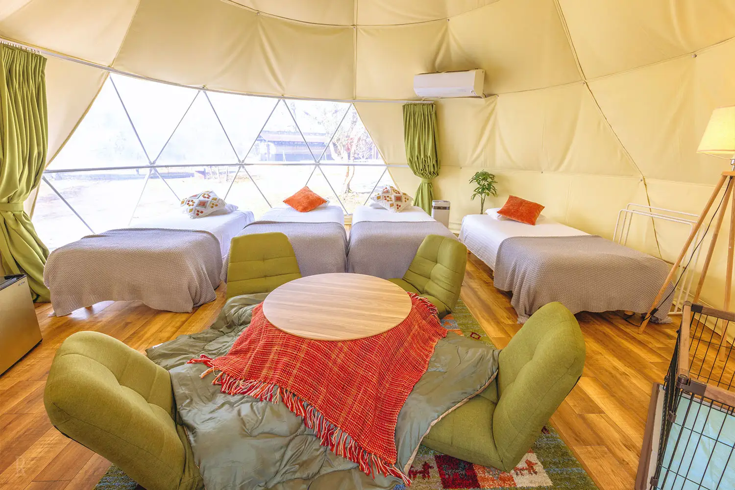 1〜15名まで対応する大・中サイズのコテージに加え、メタセコイア並木の四季をコンセプトにデザインされたドーム型グランピング(最大5名)もラインナップ。人数や用途に応じて最適な一棟を選べるほか、最大45名までのグループ貸切にも対応しており、少人数のプライベート滞在からファミリー・グループ・企業利用まで、幅広いシーンに寄り添う柔軟な滞在スタイルを実現します。