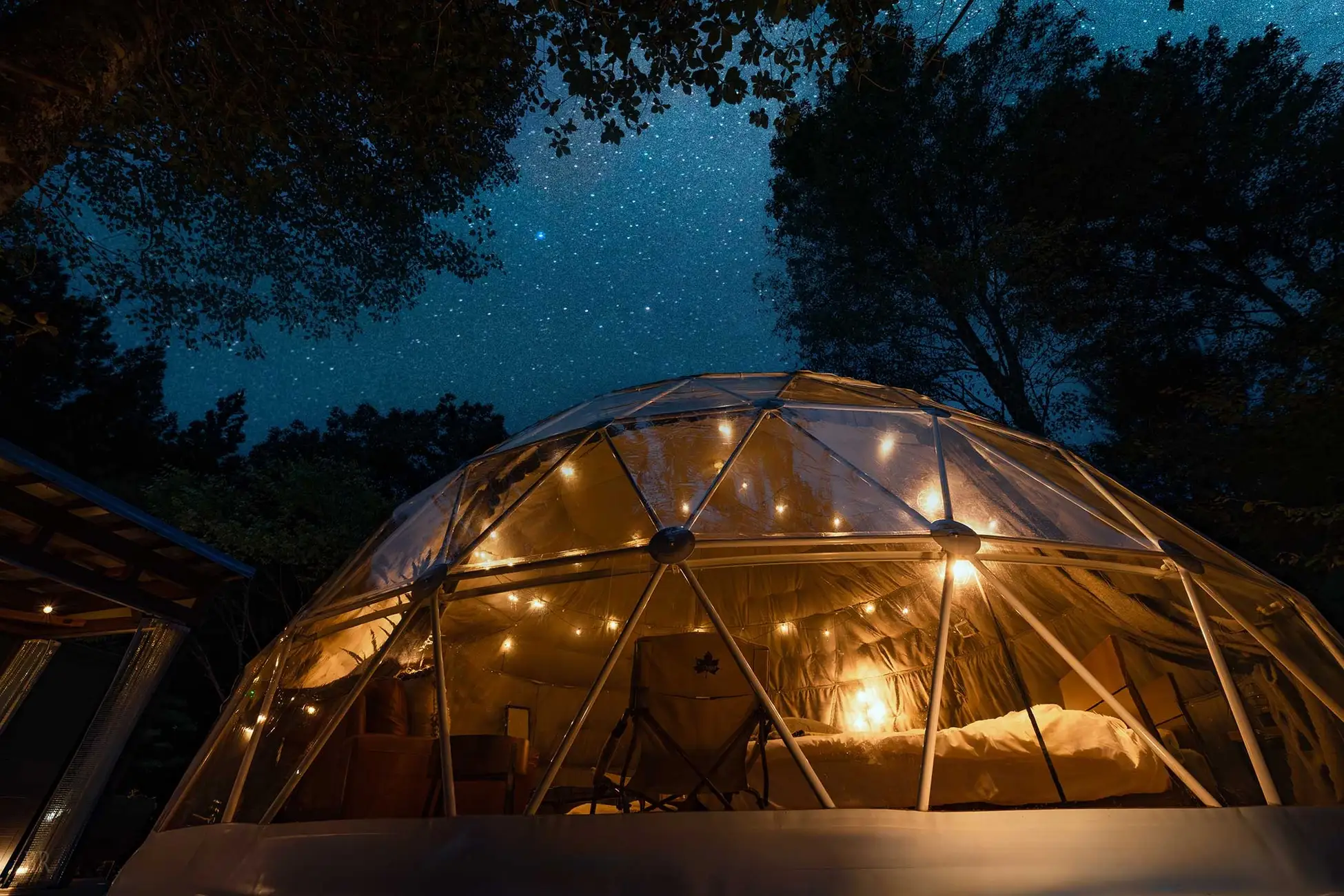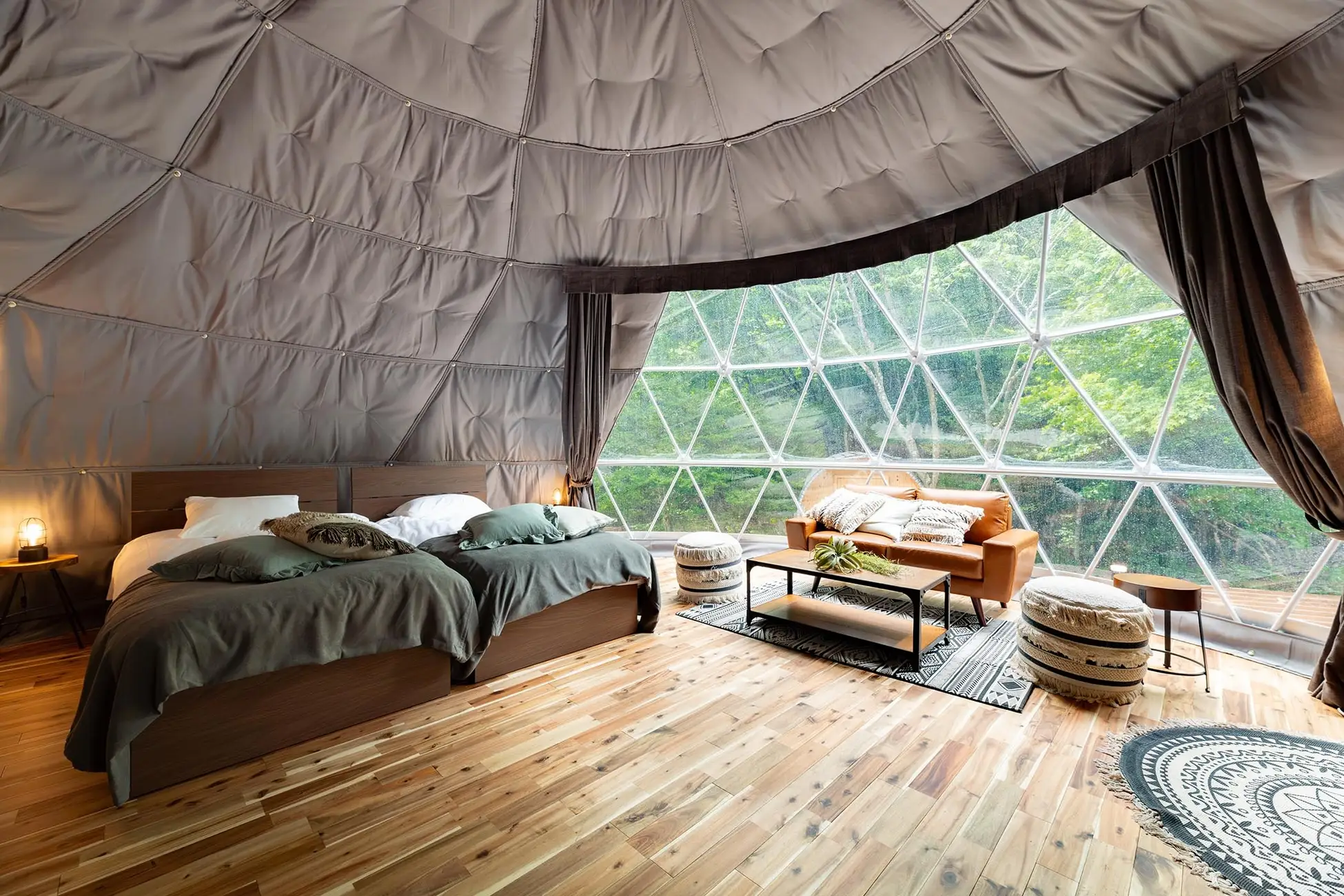 断熱性に優れた大型ドームテントを採用。全室に専用の「食事スペース」「バスルーム」「トイレ」を完備し、アウトドアの開放感とホテルのような快適性を両立しました。