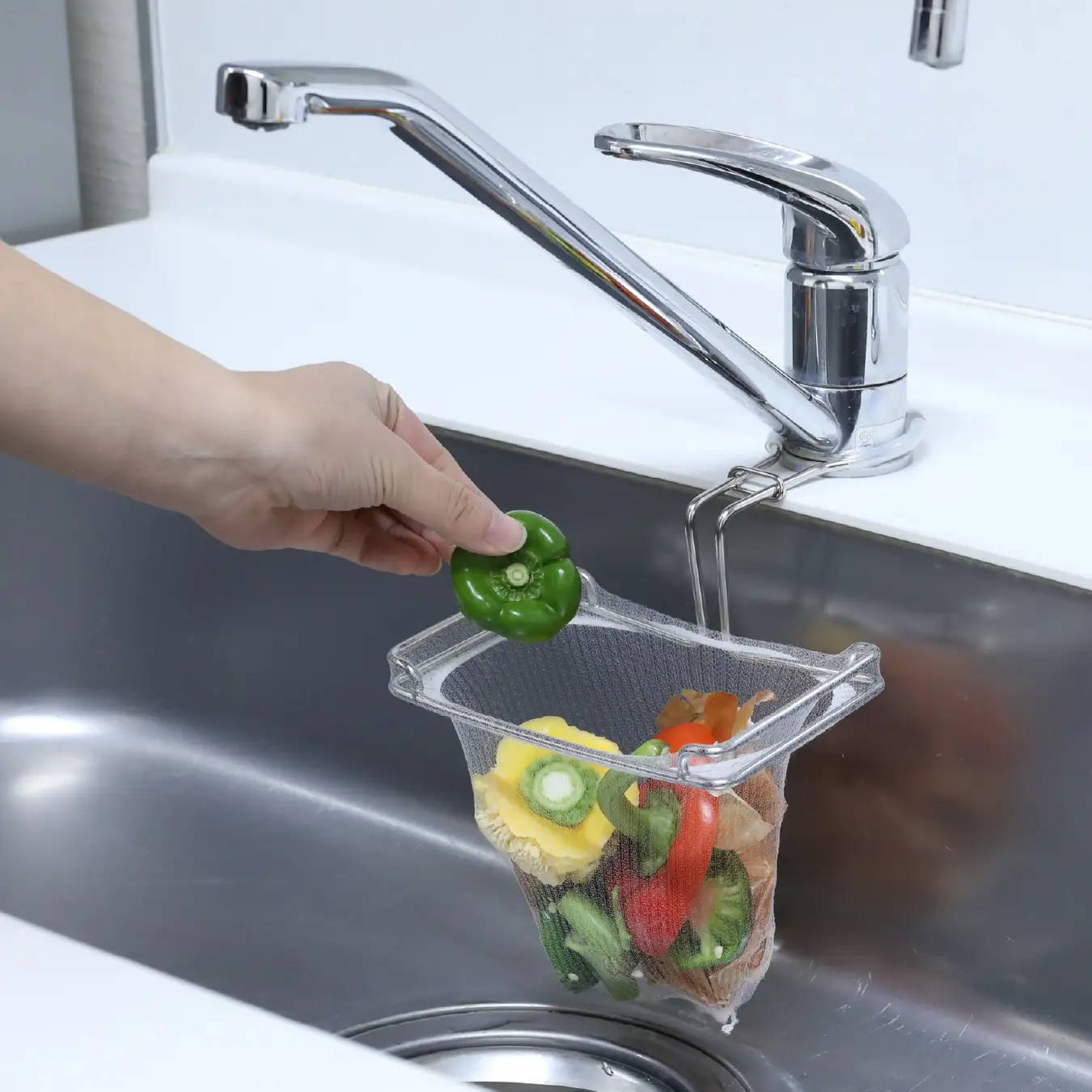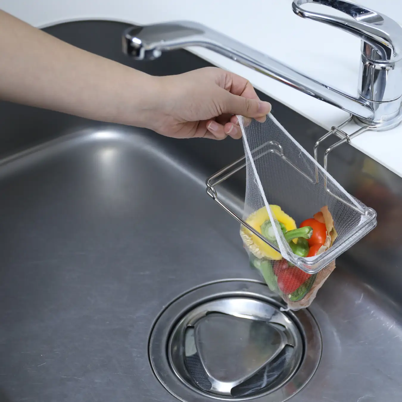 蛇口の下の空間を使って生ゴミを受け止める新しい発想の水切りホルダー。