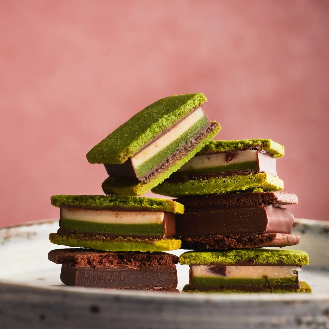 横浜市内の工房で作る自社オリジナルのホワイトチョコレート&ビターチョコレートを使用しています。ホワイトチョコレートは厳選したカカオバターを使い、優しい甘みで抹茶やいちごの香りを引き出す味わいに仕上げました。ビターチョコレートはガーナ産とエクアドル産カカオをブレンドしたこだわりのビターチョコレートです。抹茶のほろ苦さとチョコレートのマリアージュが楽しめるようなバランスを試行錯誤しました。クッキーは、今回のコラボレーションで初めて宇治抹茶をふんだんに使用する試みを実施。1枚1枚丁寧に焼き上げ、焼き色も細かく見極め選定したこだわりのクッキーです。