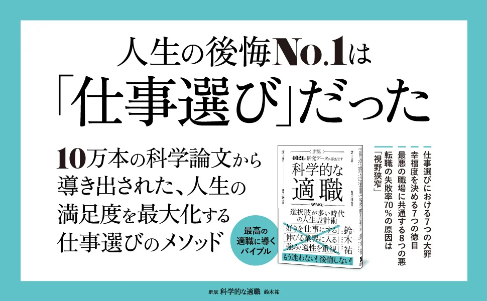 本書は、2019年12月の刊行以来、多くの支持を集めてきた書籍『科学的な適職』の新版です。10万本の科学論文の読破と600人を超える海外の学者・専門家へのインタビューをもとに、「キャリア選択」という正解のない悩みに科学的根拠で答えを出す方法を解説します。「好きを仕事にする」「給料の多さで選ぶ」といった一般的な考え方の多くが、実は科学的根拠に乏しく、むしろ適職選びを妨げる要因となることを明らかにし、真に幸福度を高める仕事選びの手法を伝授します。