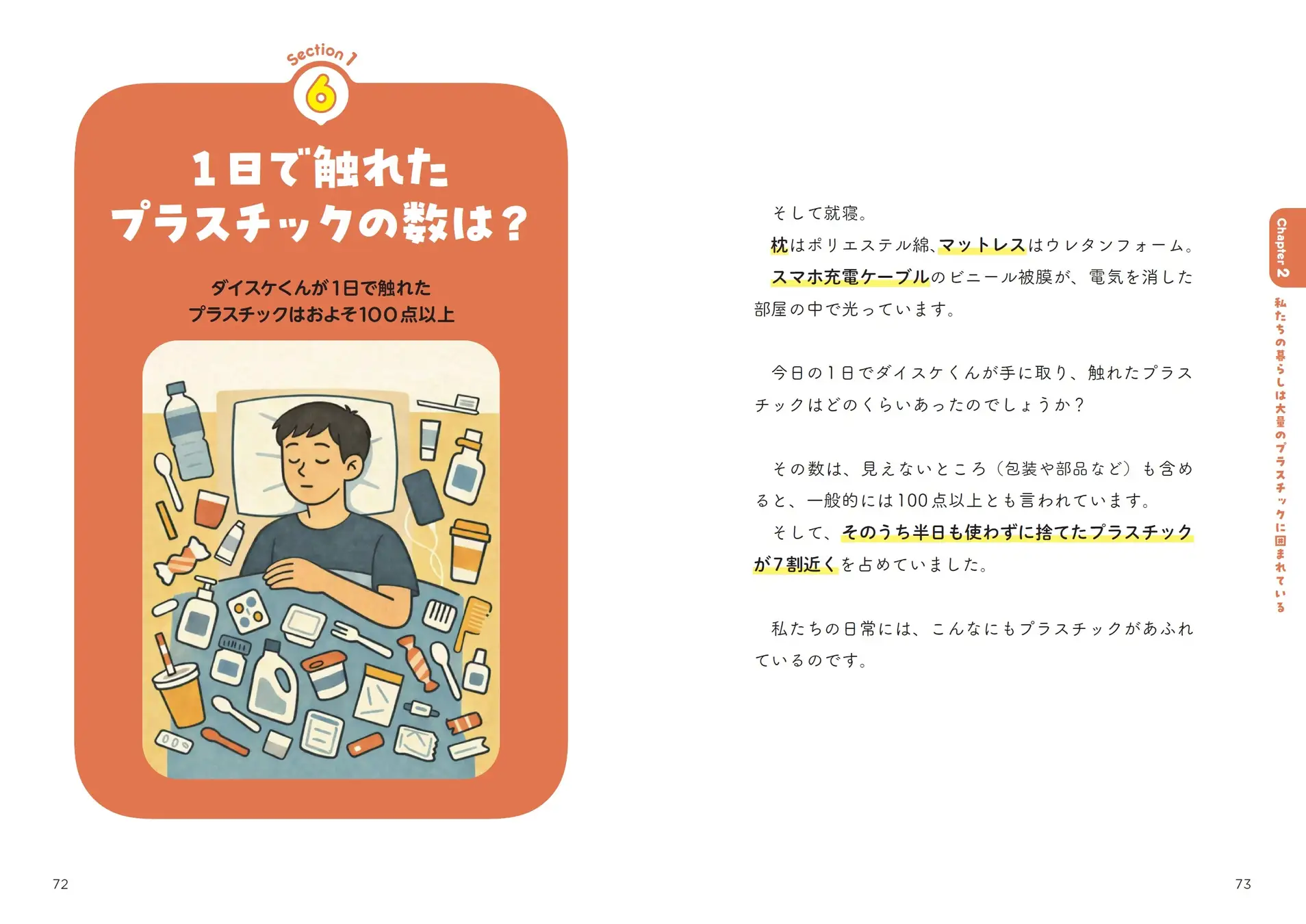 本書のユニークな特徴のひとつが、6つの章のうちの「Chapter2」の前半で、高校生「ダイスケくん」の1日を追いながら、朝起きてから夜寝るまでに触れるプラスチック製品を具体的に数えていく構成です。