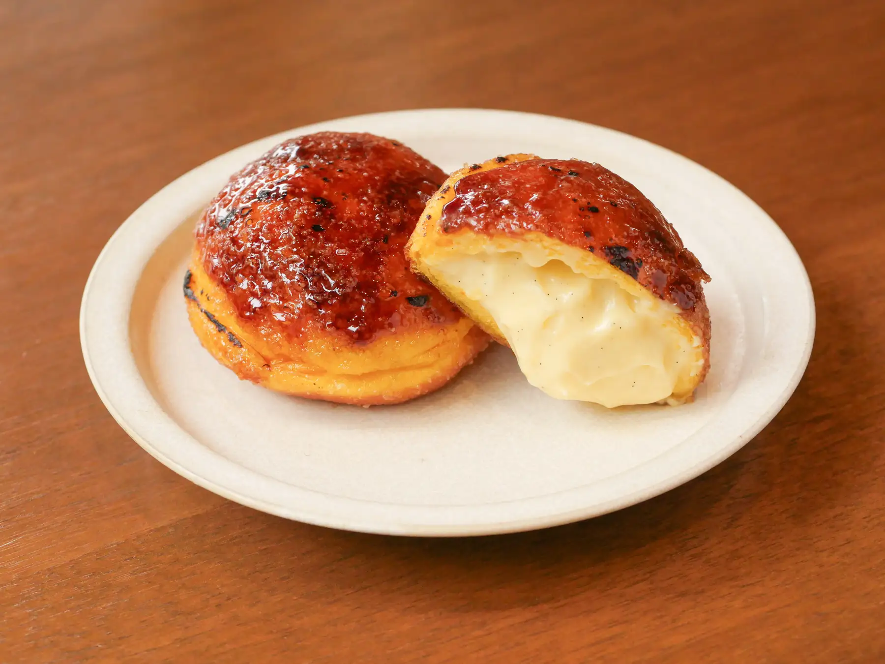丁寧にキャラメリゼされた「カソナード」の「パリッ」とした食感と、溢れんばかりに詰まった特製カスタードの「とろっ」とした濃厚なコク。ひと口ごとに響く「パリッ&とろっ」の贅沢なコントラストは、まさにクレームブリュレ。生地の弾力とともに、至福のハーモニーをお楽しみください。