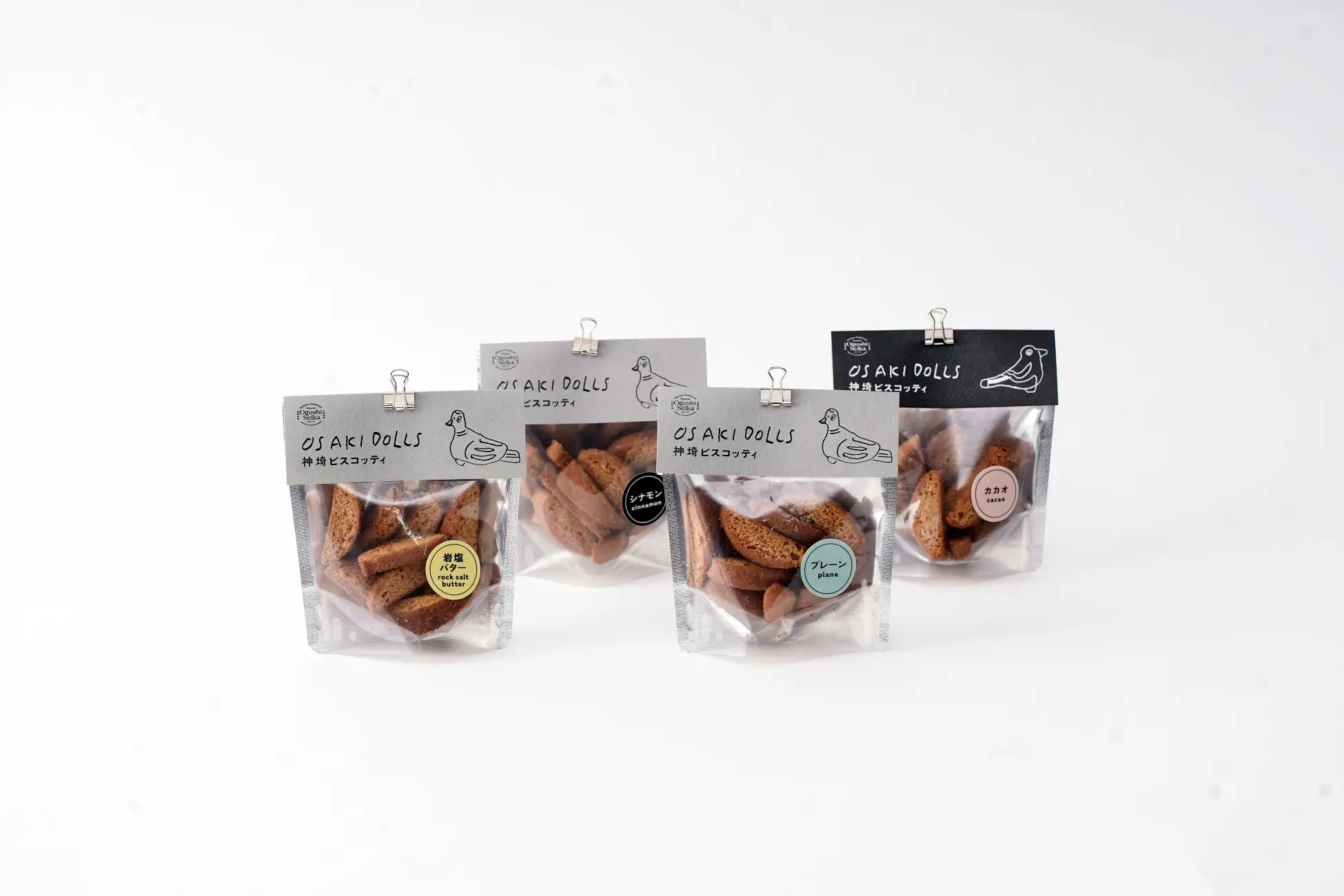 作りすぎた丸ボーロにバターを塗って二度焼きしたところ、とても美味しかった、というエピソードから生まれた人気のビスコッティです。定番の「プレーン」「岩塩バター」「シナモン」に加え、カカオ味の「カチガラス」もラインナップしています。