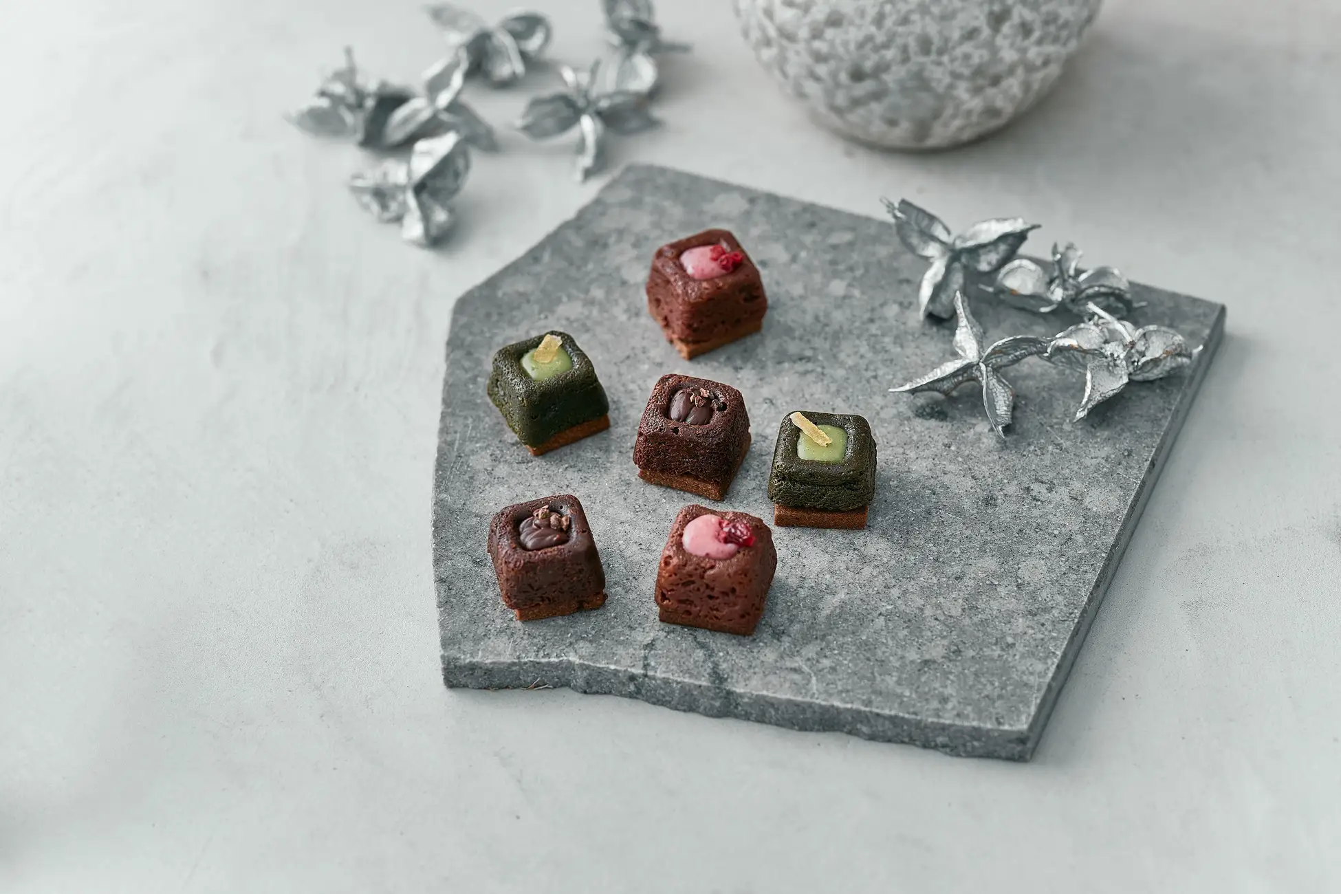 ガナッシュ、生地、サブレという独自の3層構造にアクセントのトッピング素材をあしらったフォンダンショコラです。