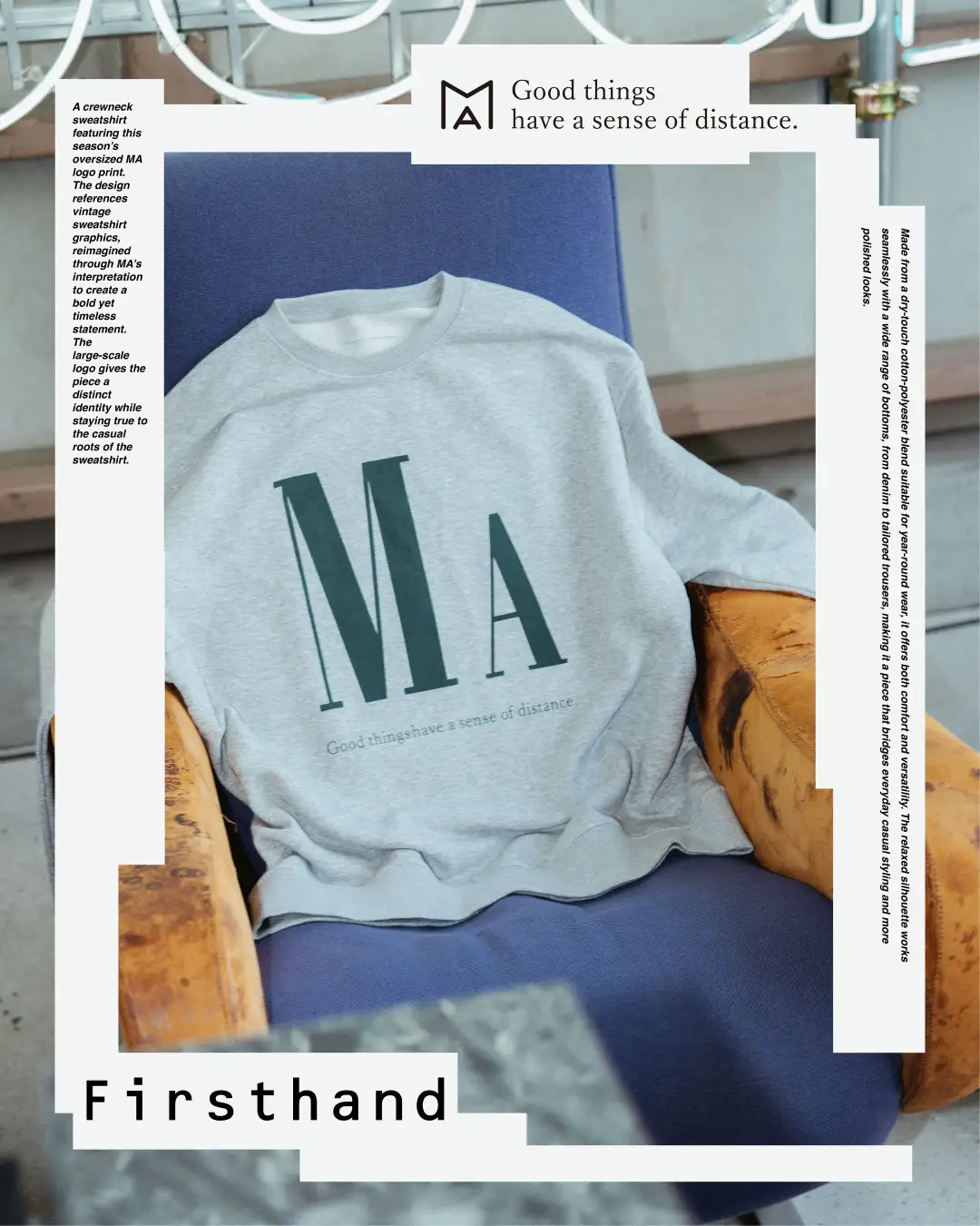 シーズナルの大判ロゴを配したクルーネックスウェット。ヴィンテージスウェット風のモチーフを、MAの解釈で再編集したロゴを採用。