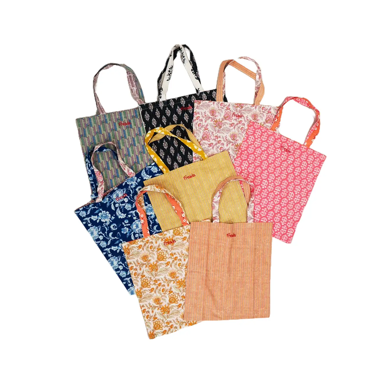 Freadaのアイテムが生産されているインドの縫製工場で出たブロックプリントの残布を使ったトートバッグを、ご購入の方にプレゼント!
