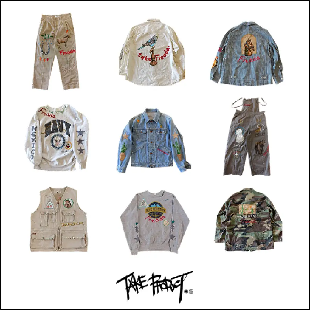 「生活から民芸、ときどきPUNK」をテーマに活動する「Take Product」竹内氏とFreadaによる共同企画 #TakeFreadaは、古着に手刺繍を加え、一点ものとして新たな価値を生み出すプロジェクト。オンライン販売は行わず、対面での手売りにこだわる姿勢も魅力のひとつ。今回は、10月中旬にFREAK’S STORE京都で初披露された、ペイントと刺繍を組み合わせた新作が登場。