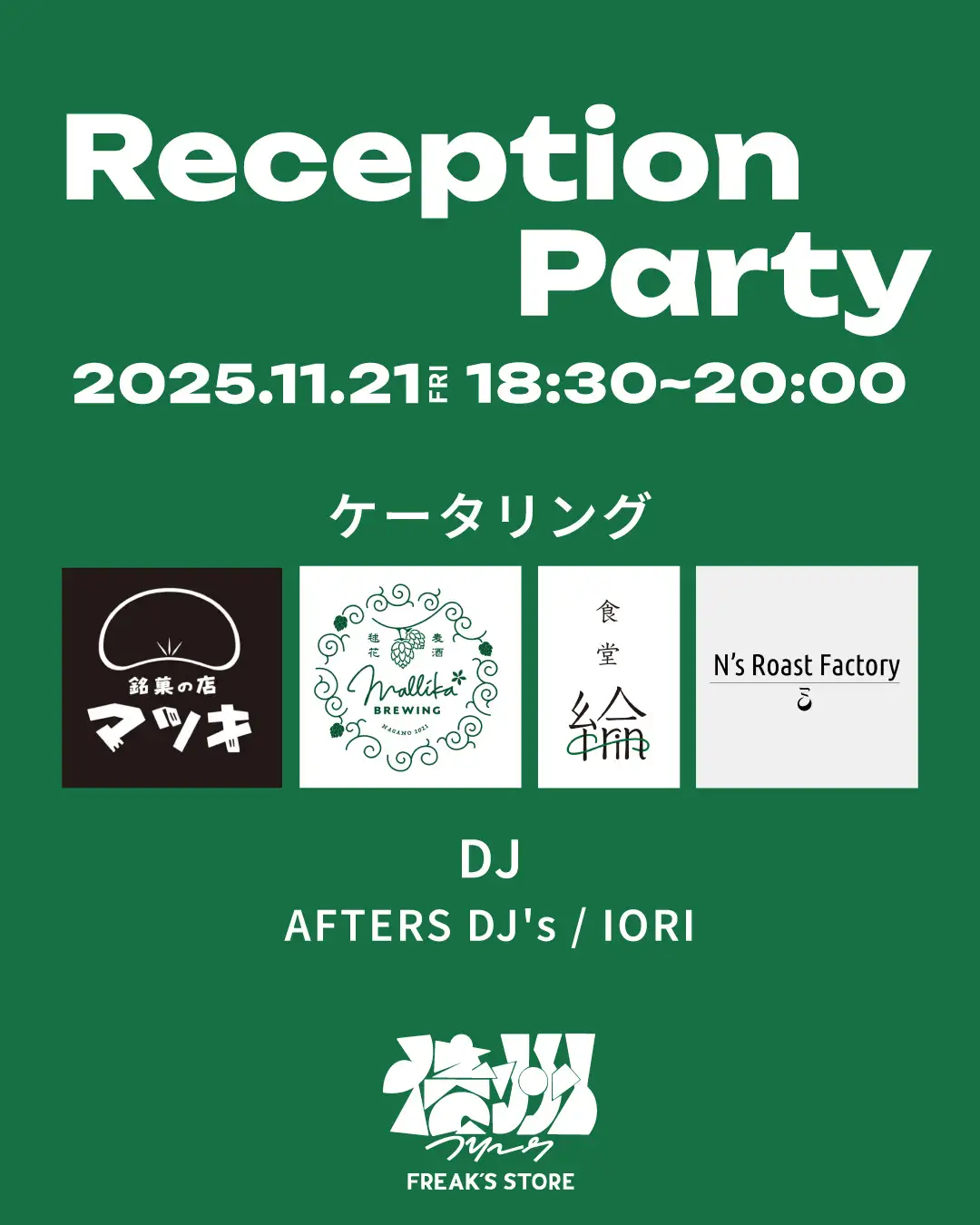 日頃の感謝の気持ちを込めて、FREAK’S STORE長野が“人と人がつながる場所”となるレセプションパーティーを開催します。Daytona Park会員の方(当日入会も含む)は地元で愛される飲食店のフードとクラフトビールなどのケータリング提供やDJによる音楽ライブをお楽しみいただけます。