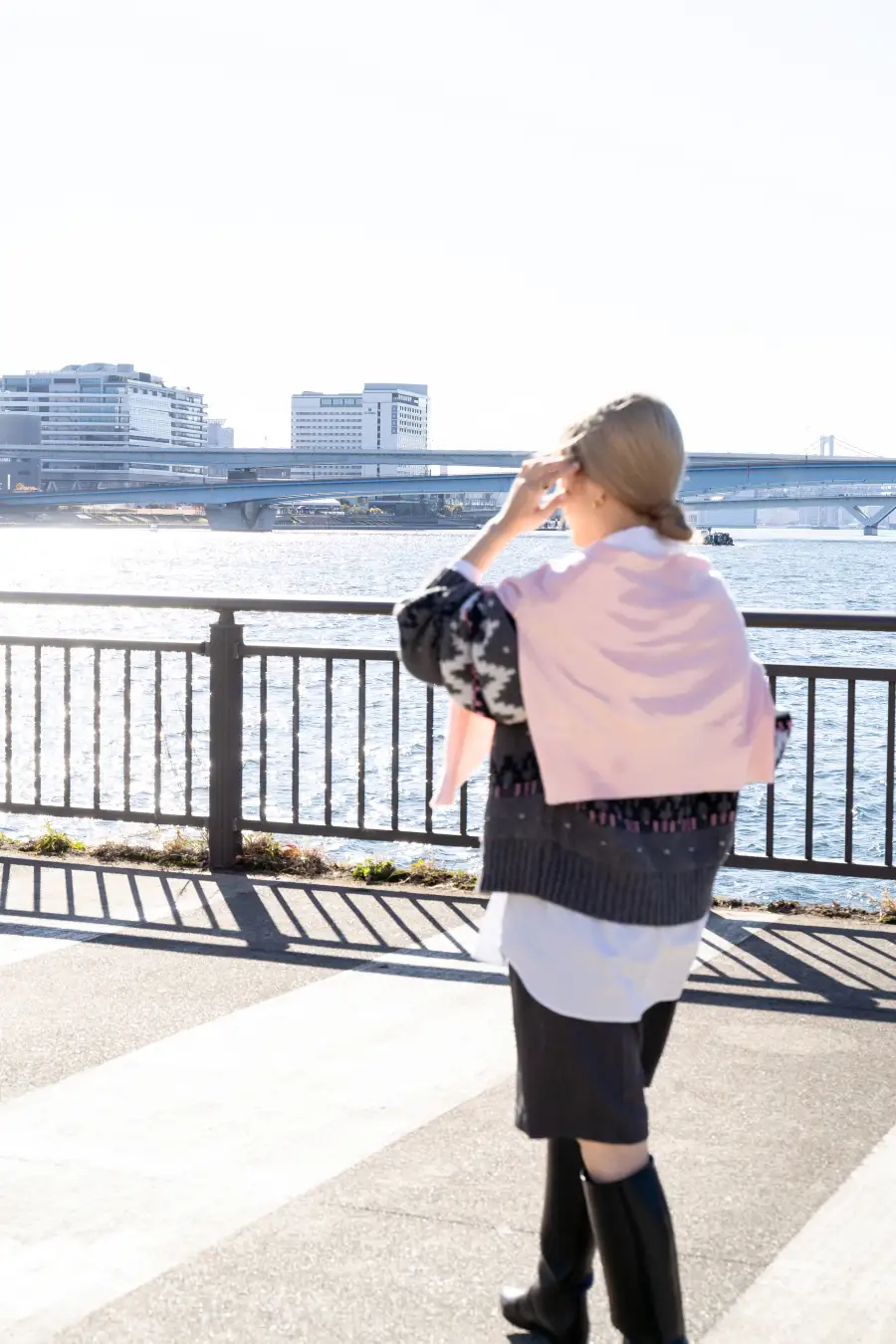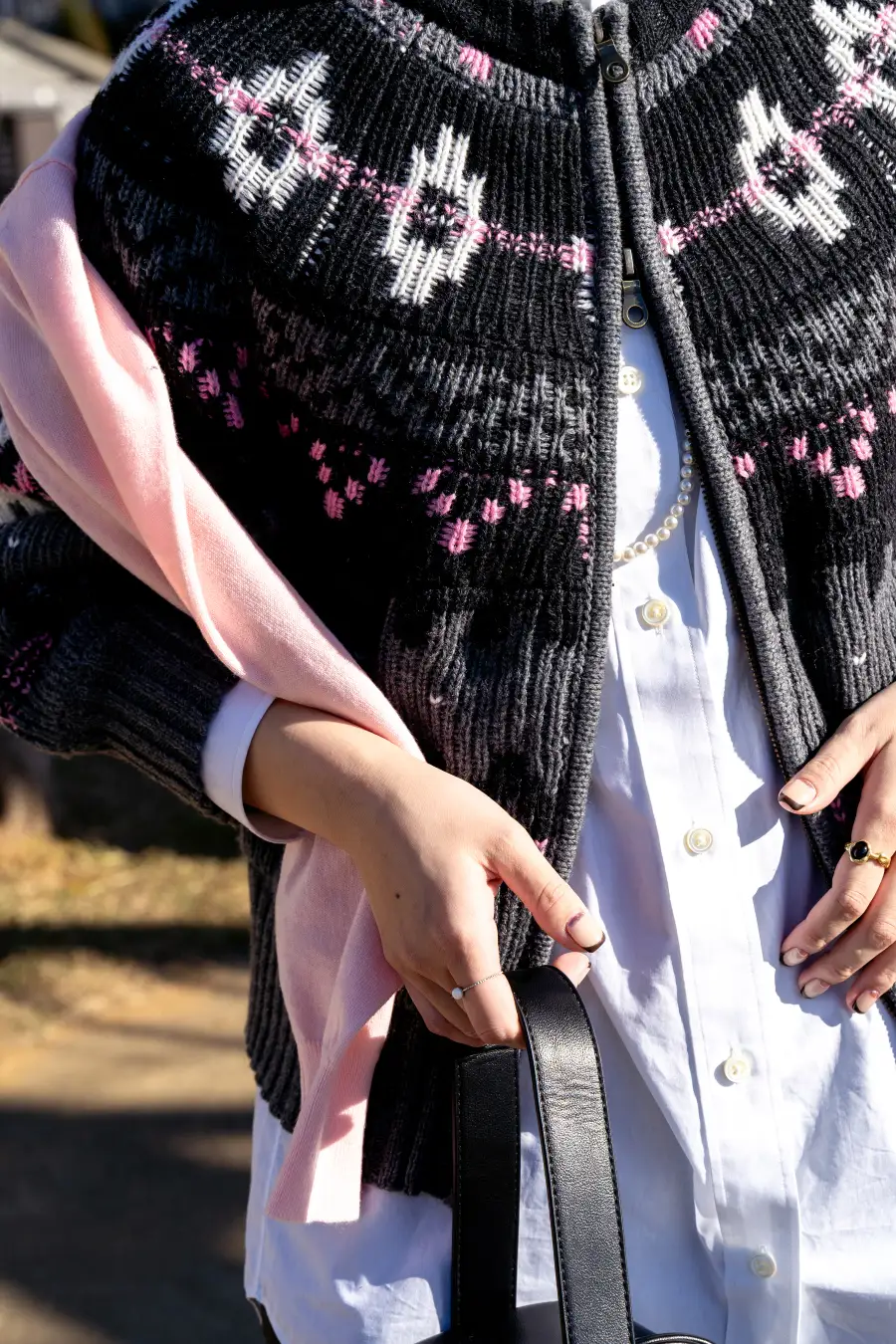 ホリデーシーズンはロングブーツが履きたくなります。ノルディック柄がカジュアル過ぎないオトナコーデを意識しました。ピンクとグレーで統一感のあるコーディネートです。