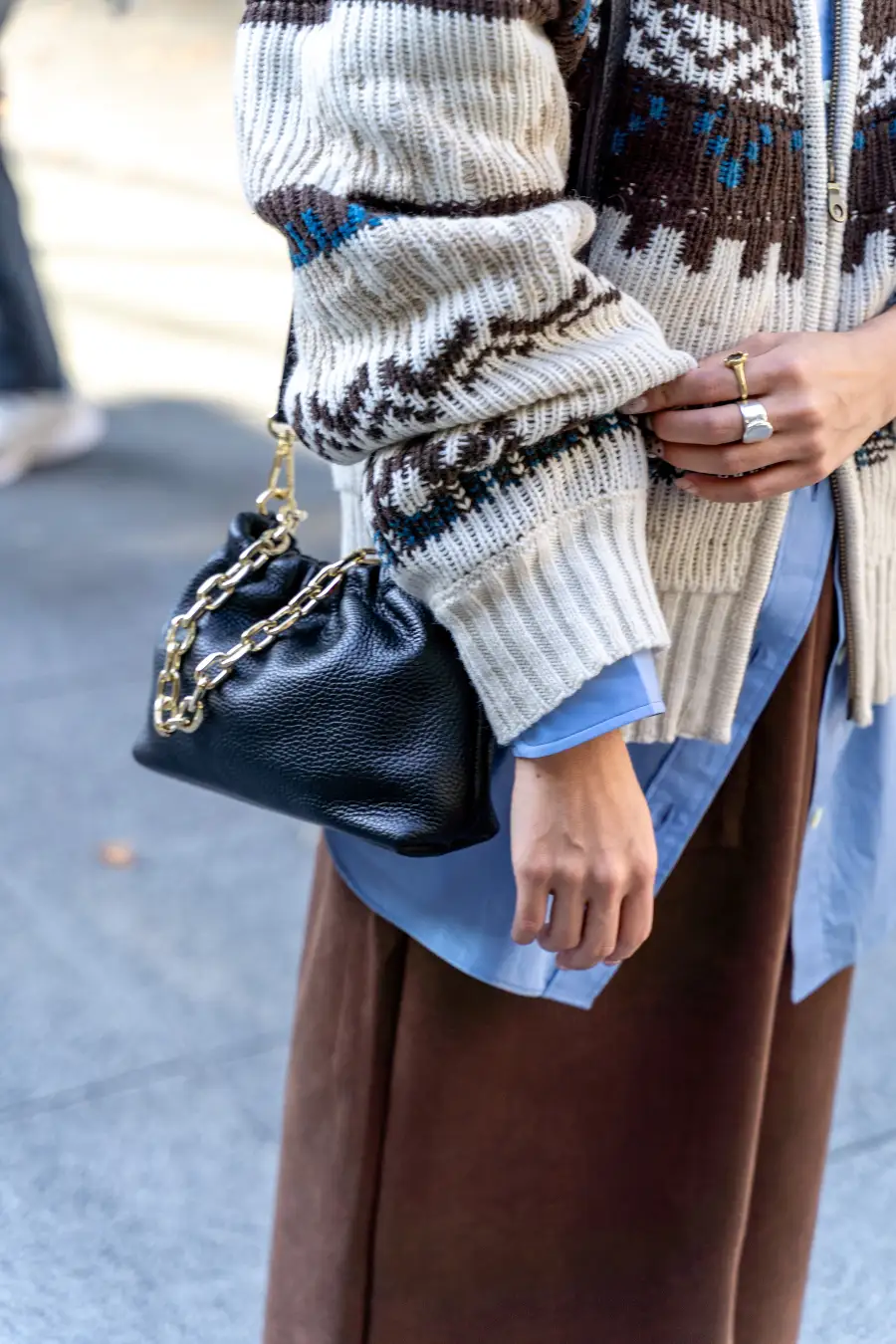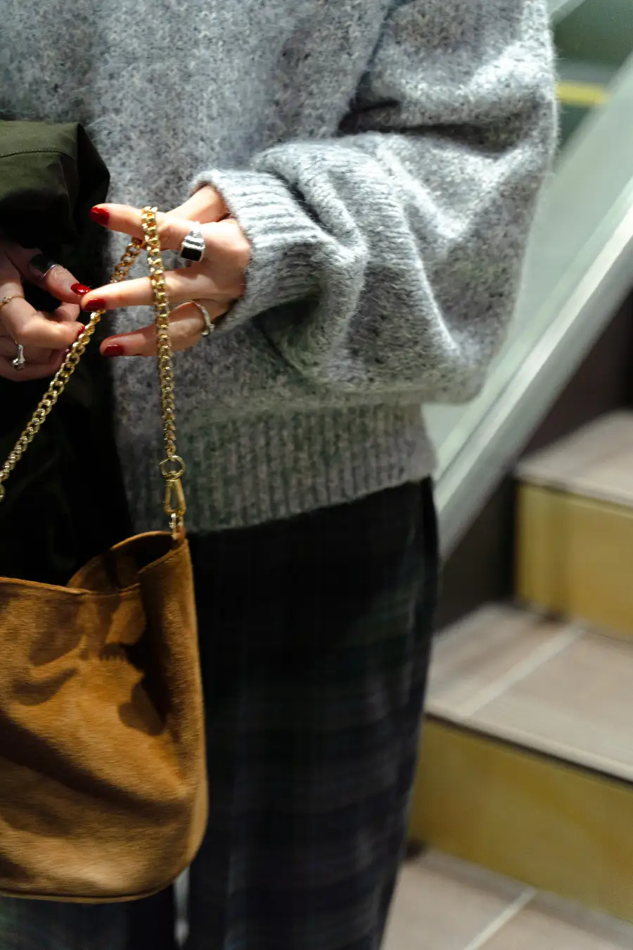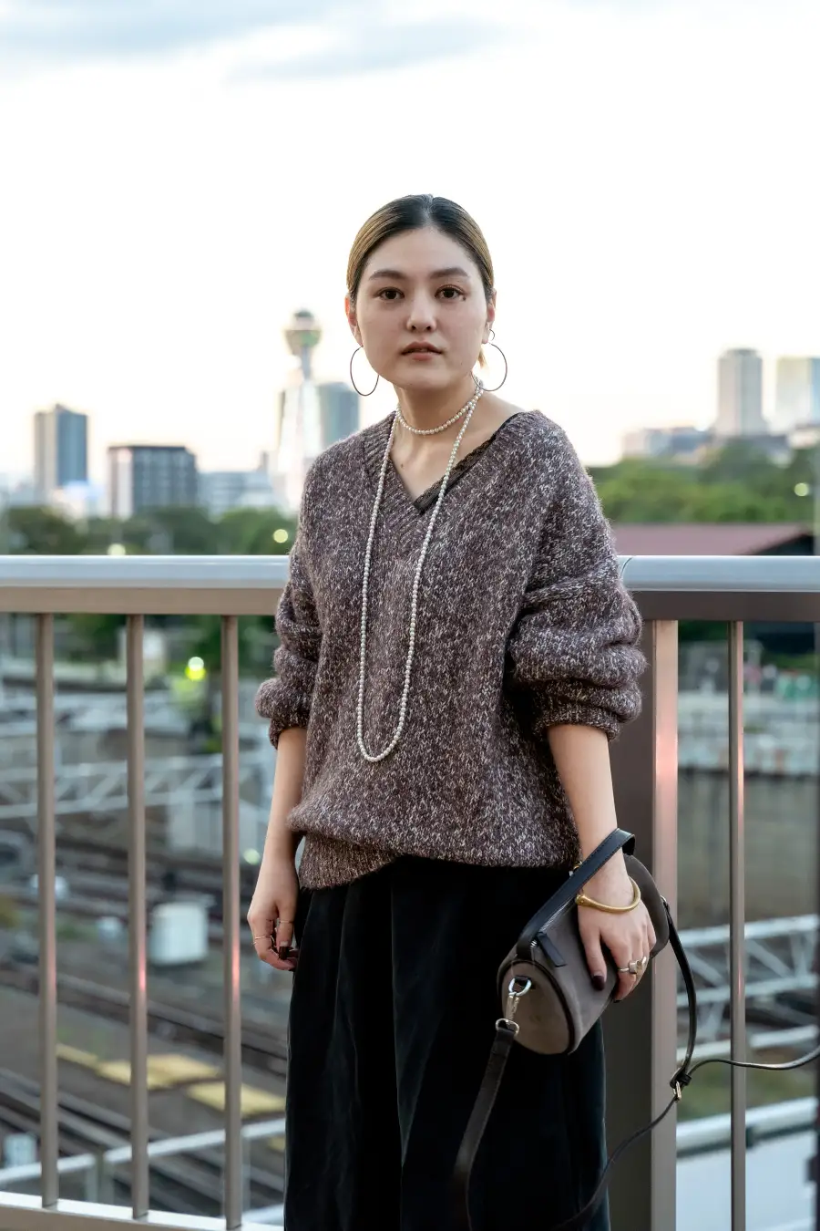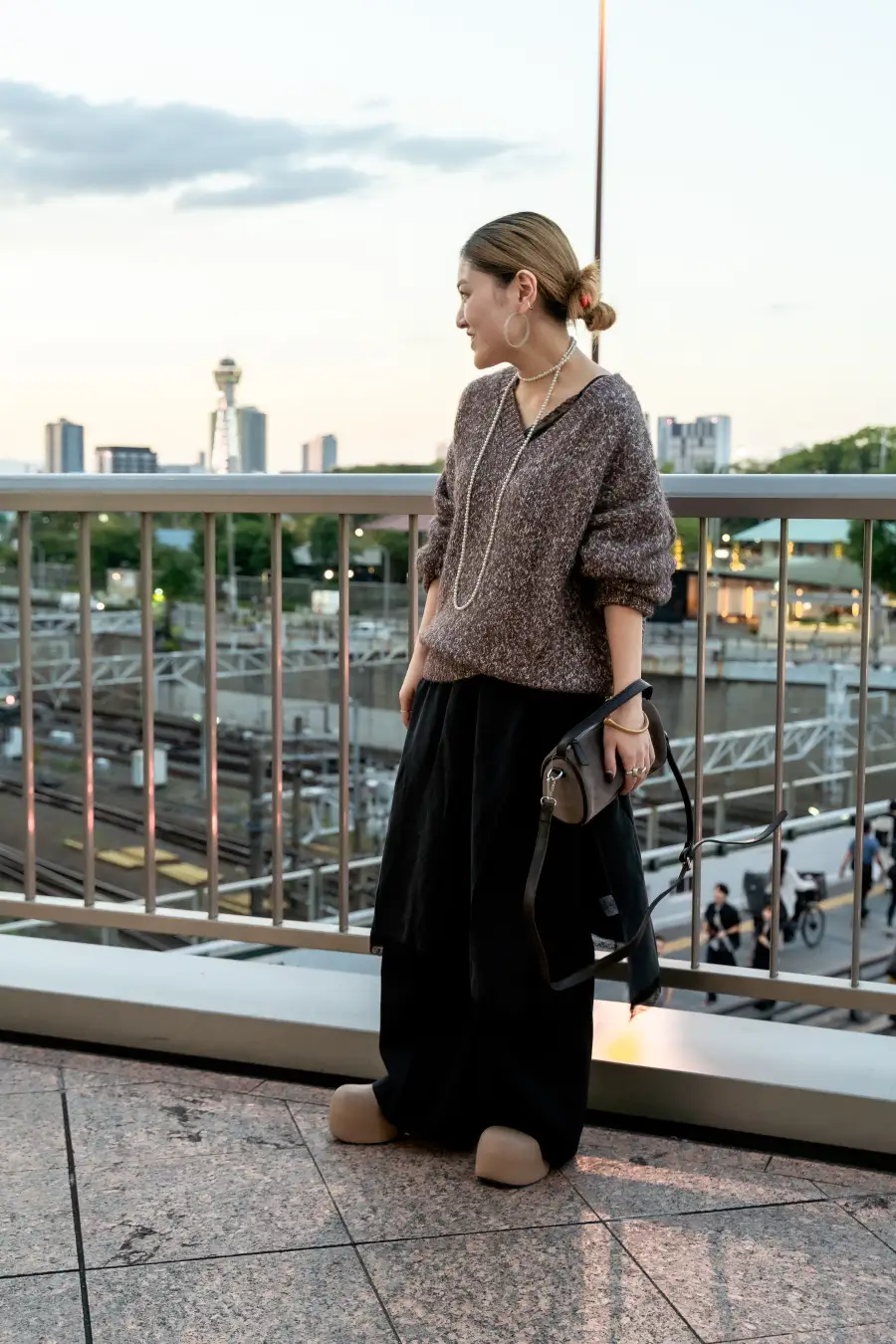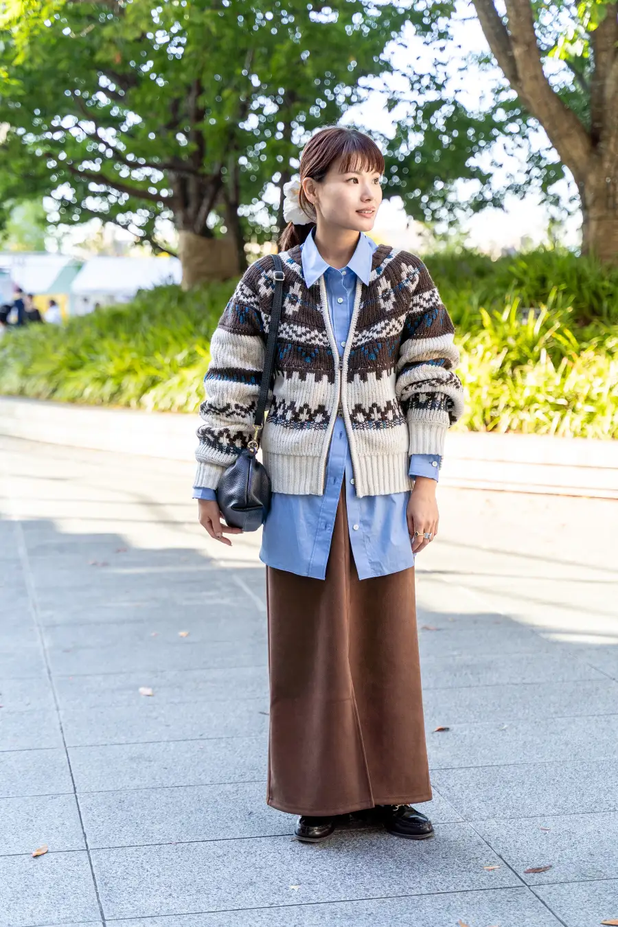 ニットのブラウンを活かして、今っぽさと温かみのあるコーディネートに。クリスマスということで少しだけ可愛らしい印象になるような色味とアイテムで組んでみました。