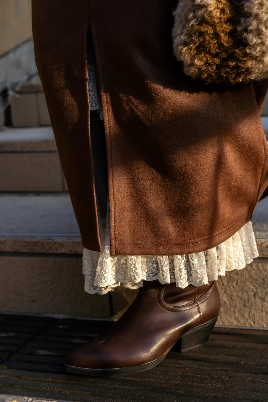 トレンドのコンパクトポロニットに、よりレディースらしく見えるようレースインナー合わせ。可愛くなりすぎないよう、スラックスで大人な雰囲気に。今気分のブラウンのアウターでクリスマスにぴったりなスタイリング。