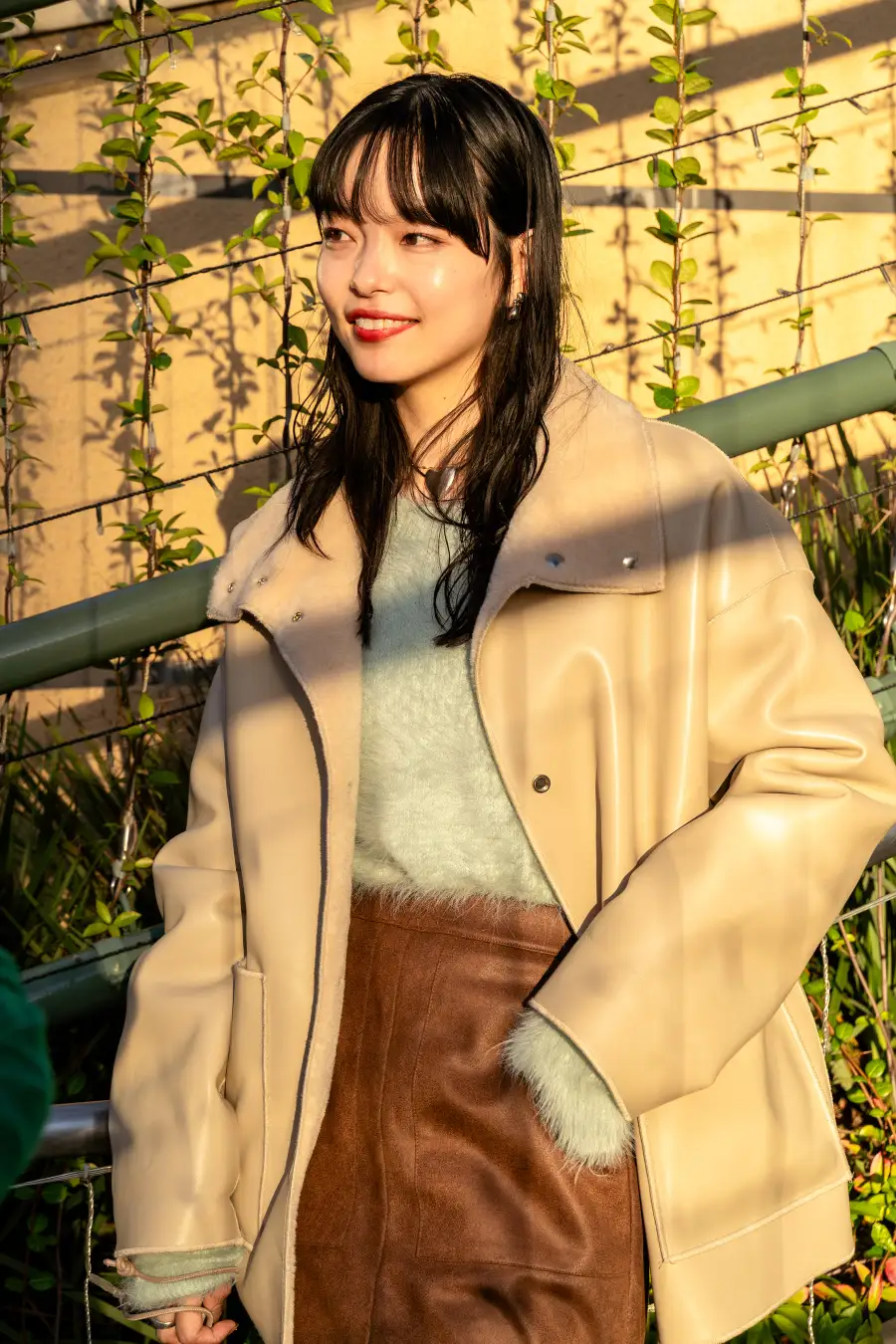 レースレイヤードとミントグリーンで冬の透明感を演出。ボアアウターとファーバックで季節感と温もりをプラス。冬の街並みやイルミネーションにも映える配色です。