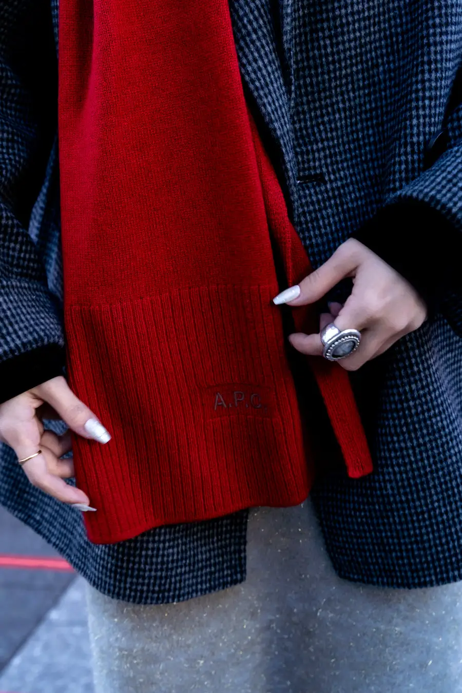 ニットとスカートでクリスマスカラーのレッドを取り入れたのがポイント。アウターを脱ぐと一気に華やかな印象に。