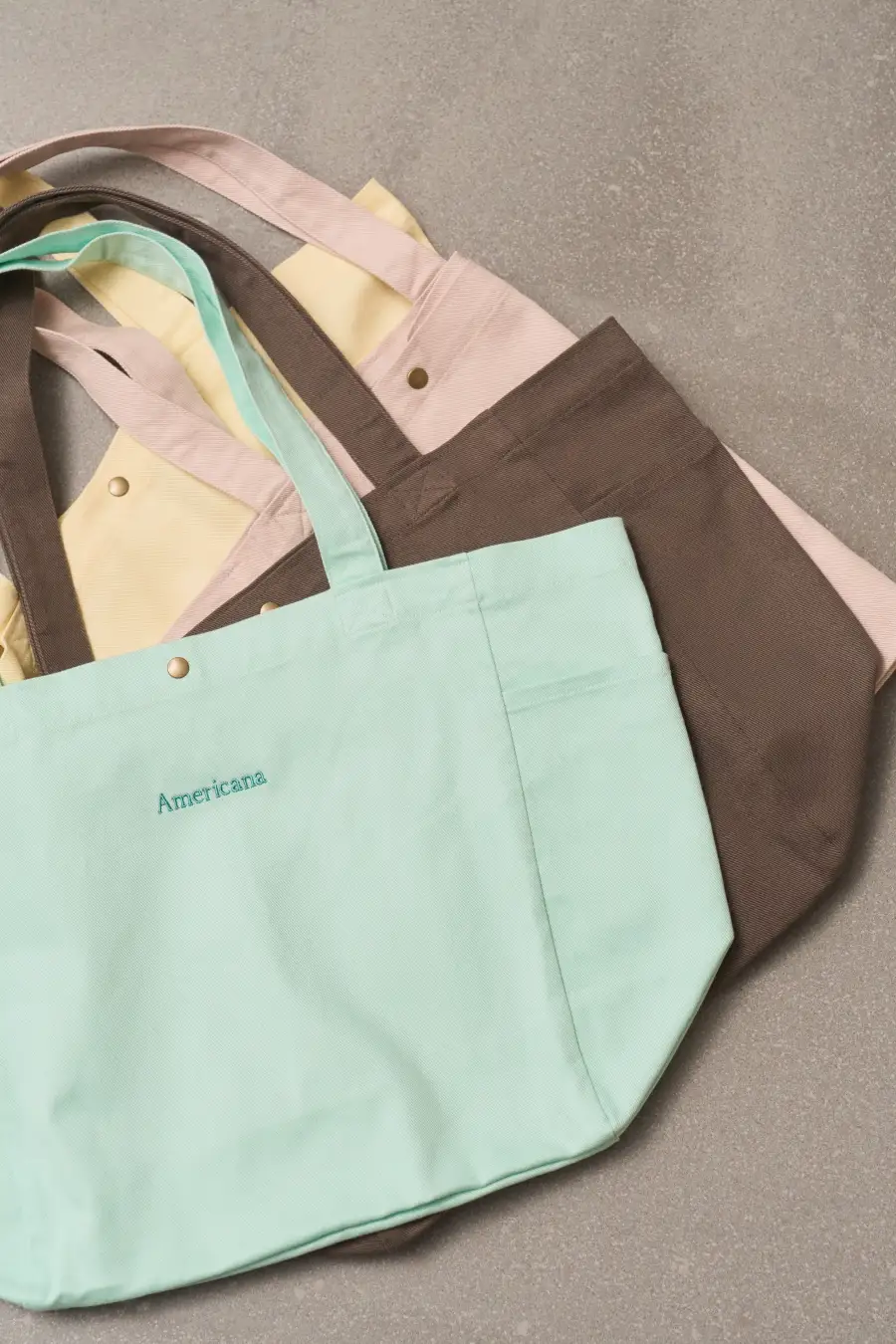 「AMERICANA」からはトートバッグ2型とスウェット、「NOMADIS」は人気バッグのカラー別注、「Healthy Denim」はデニムパンツと羽織りをラインアップ。春らしいカラーリングや軽やかなデニム素材で仕上げた、これからの季節に活躍するアイテムが揃いました。