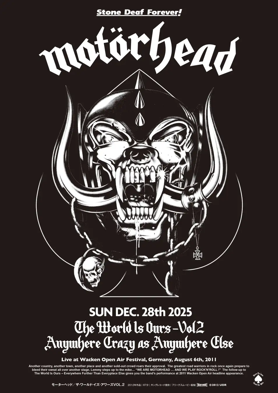 今年上映されるのはレミーの死の約4年前、2011年にドイツのヘヴィ・メタルフェスティバル、ヴァッケン・オープン・エアでの暴走ロックンロールショウの模様を収録したライヴ作品『モーターヘッド/ザ・ワールド・イズ・アワーズVOL.2』。
