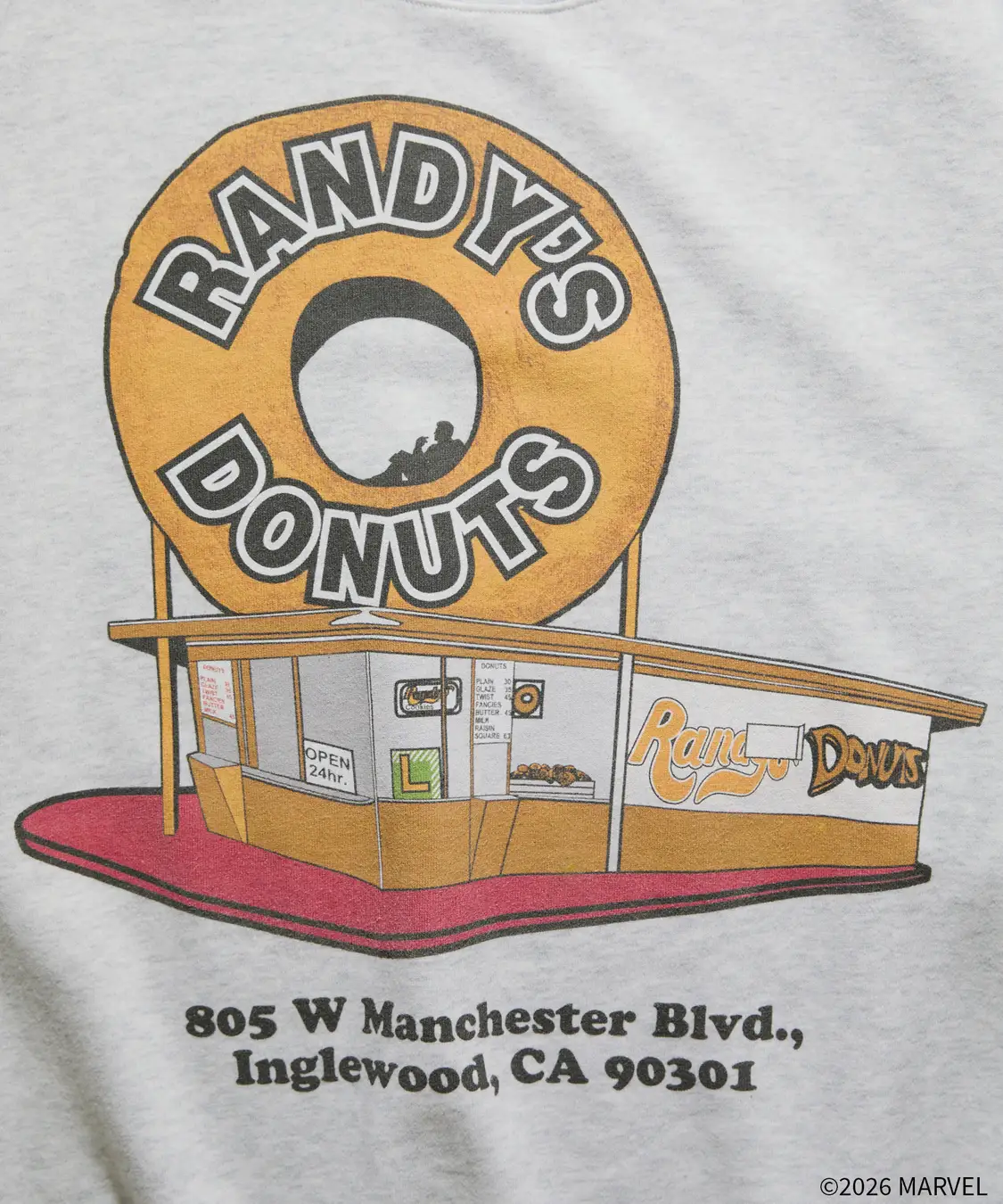 カリフォルニア、ロサンゼルスのイングルウッドにある「ランディーズドーナツ」1号店の屋根上にそびえ立つ直径約10m(32 フィート)の巨大なドーナツ型サイン看板にアイアンマンが座ってドーナツを食べるあの名シーンを再現しプリント。