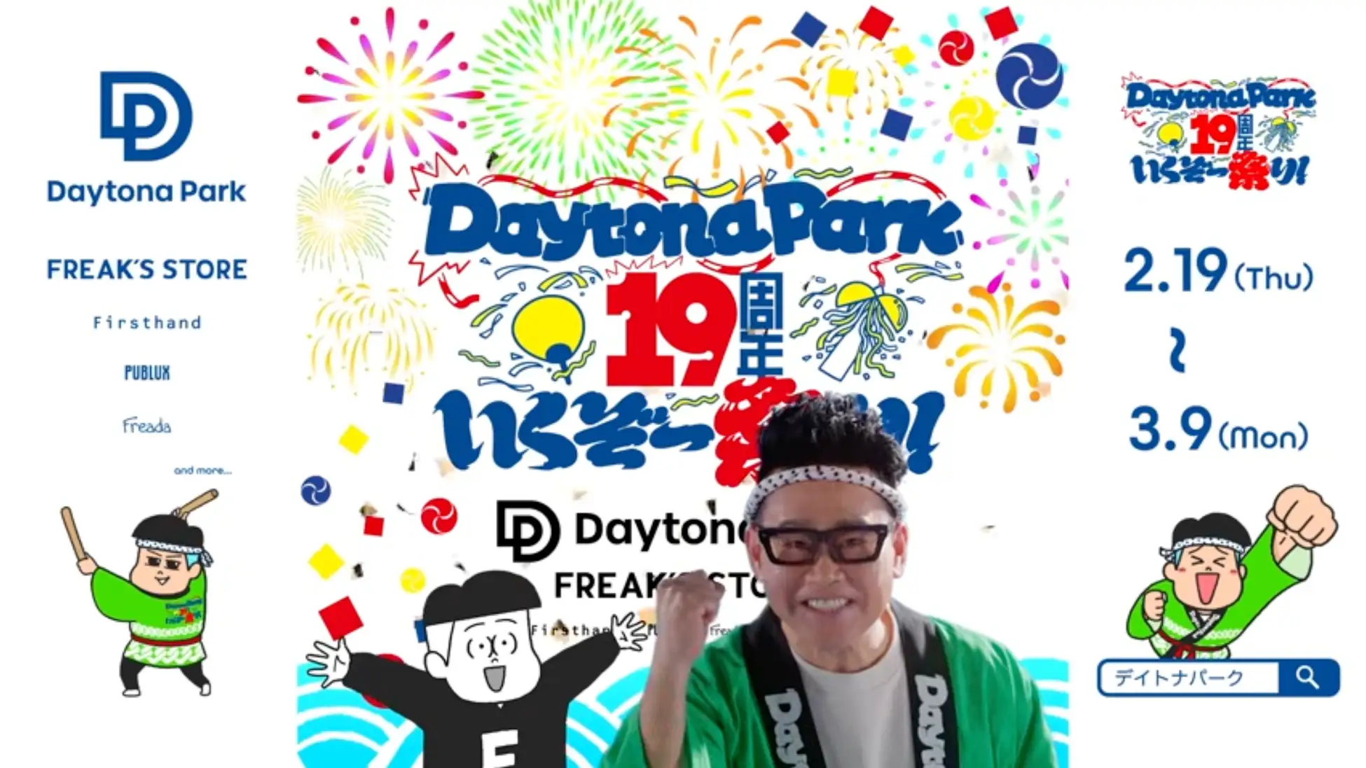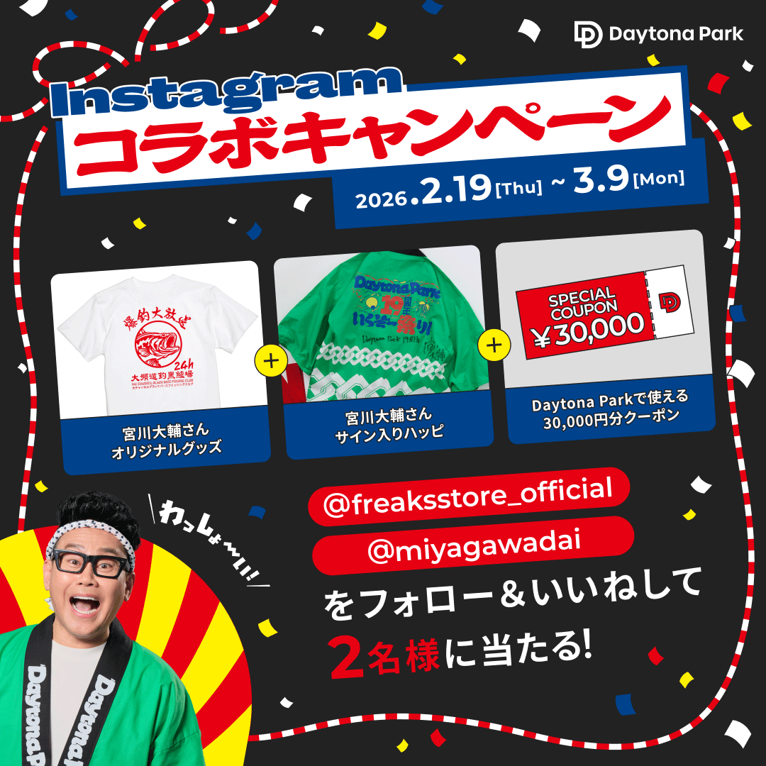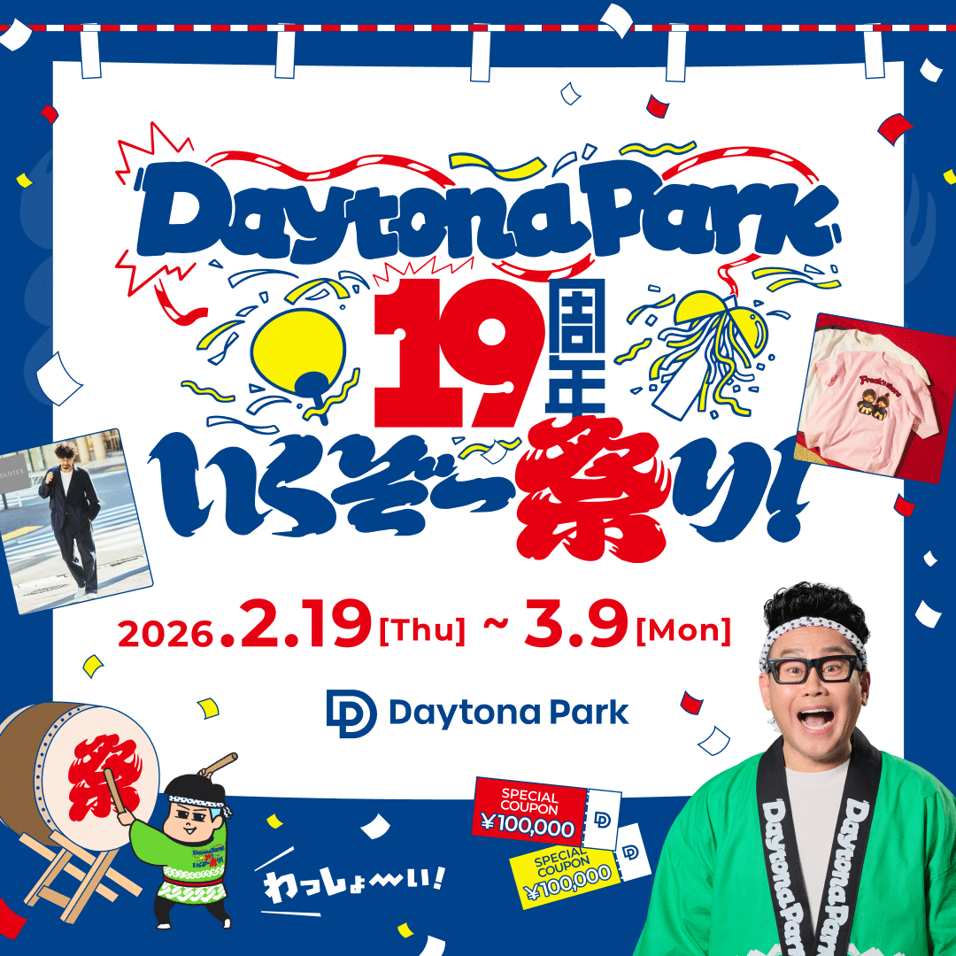 セレクトショップ「FREAK’S STORE」などを運営する株式会社デイトナ・インターナショナルの公式オンラインストア「Daytona Park(デイトナパーク)」にて、2月19日(木)より、大型キャンペーン「19周年いくぞー祭り」を開催します。本キャンペーンは、「祭り」をテーマに、宮川大輔さんと一緒にワクワク・ドキドキの体験を提供するアニバーサリー企画です。