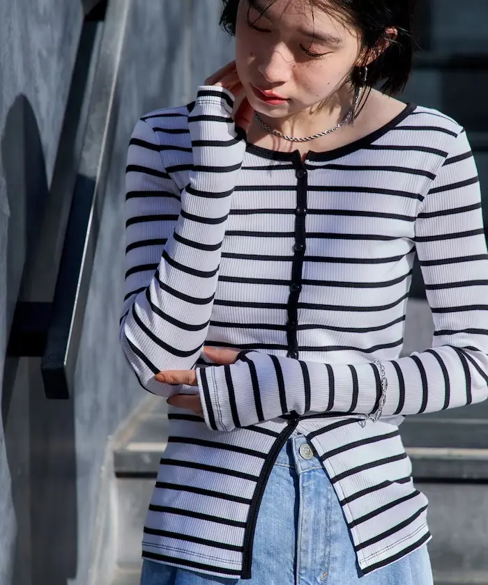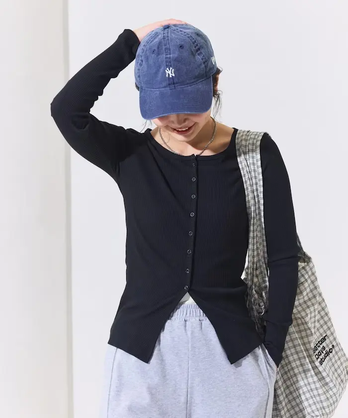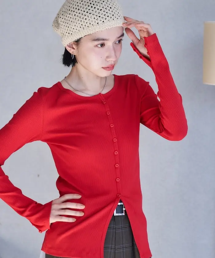 長めの着丈にあえてボタンは下まで付けず、裾を開いて着用できるトレンド感のあるシルエットが魅力のカーディガン。