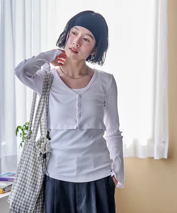 ショート丈カーデと同素材タンクのセットなので、レイヤードが簡単に決まり統一感のある着こなしが完成。袖口は長めに設定され、手元でくしゅっとたまるデザインがポイント。