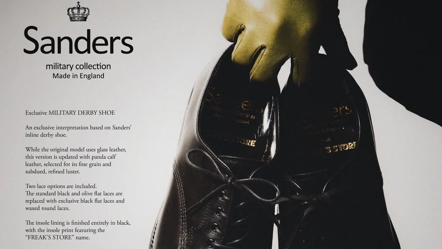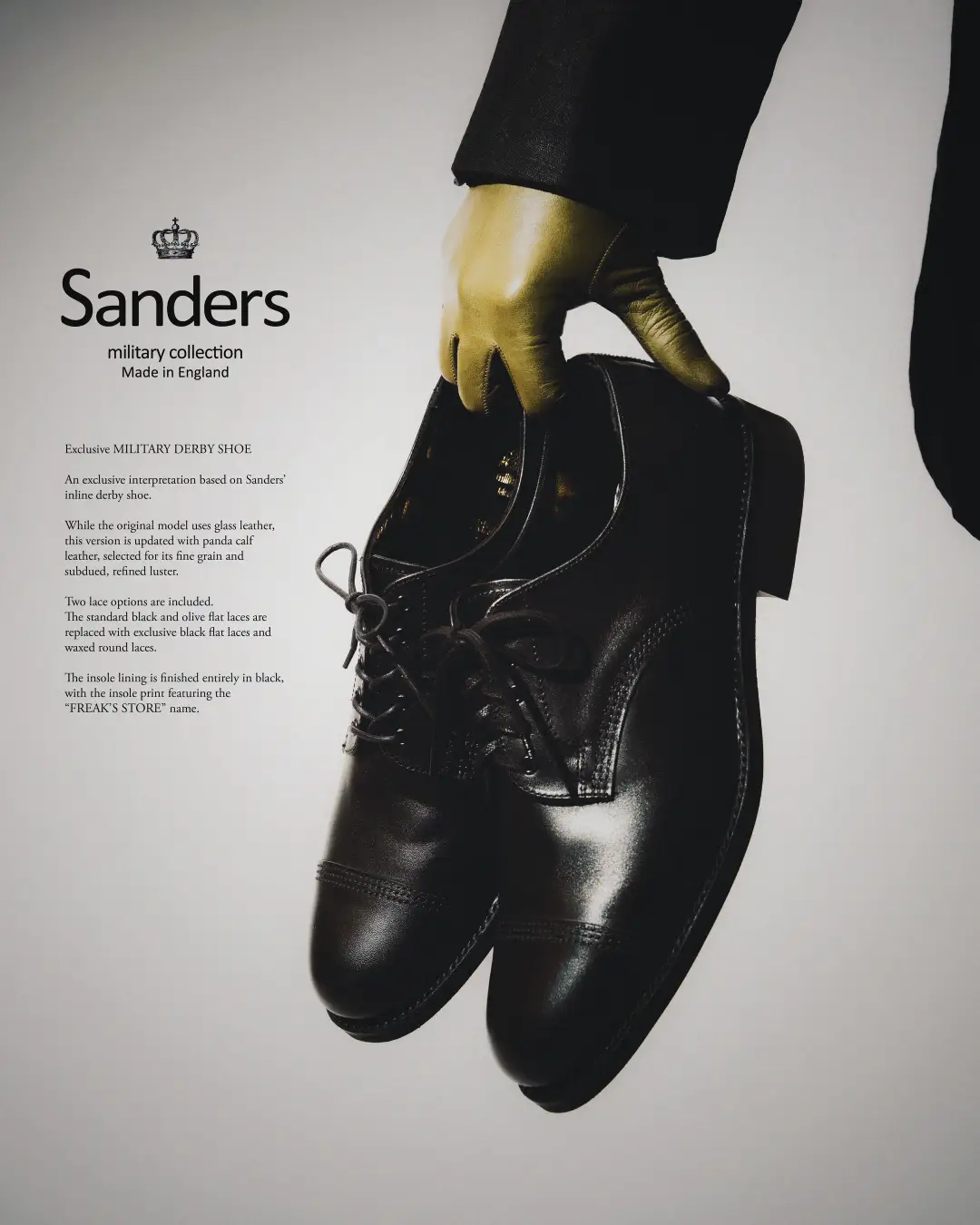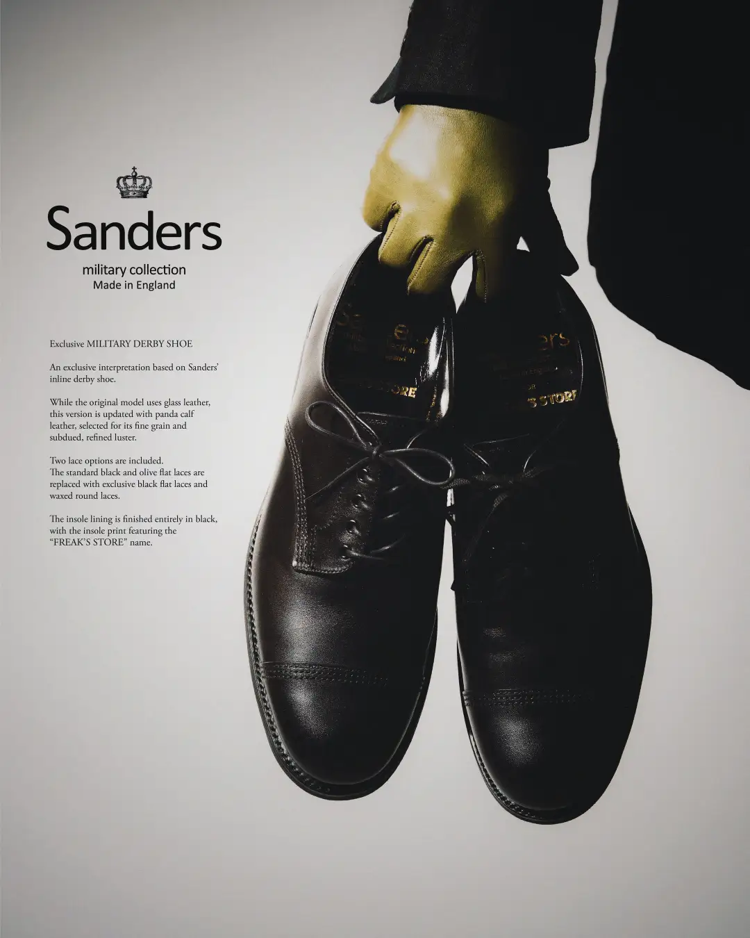 老舗シューメーカー「Sanders(サンダース)」にFREAK’S STOREが別注したシューズ”MILITARY DERBY SHOE”が登場。Sandersのインラインではよく見られる、光沢感のあるポリッシュドレザーをFREAK’S STORE別注ではマットな質感のパンダカーフに変更。シューレースは通常ブラックとオリーブの2色のフラットシューレースが付属するところ、ブラックのフラットシューレース・ブラックのラウンドレースを付属し、よりクラシックな表情で履ける仕様に仕上げました。またインソールのライニングをオールブラックに変更し、インソールのかかと部分には「Sanders」と「FREAK’S STORE」のダブルネームがプリントされた特別仕様になっています。