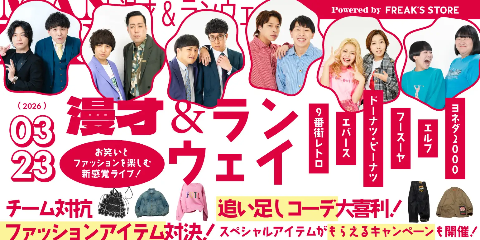 株式会社デイトナ・インターナショナル(本社:東京都渋谷区/代表取締役社長CEO 高橋 正博)が運営するセレクトショップ【FREAK’S STORE(フリークス ストア)】と株式会社吉本興業がタッグを組み、 3月23日(月)にお笑いとファッションを楽しむ新感覚ライブ『漫才&ランウェイ Powered by FREAK’S STORE 』をCOOL JAPAN PARK OSAKA TTホールにて開催します。イベント出演者は〈エバース〉〈ヨネダ2000〉〈エルフ〉〈ドーナツ・ピーナツ〉〈9番街レトロ〉〈フースーヤ〉の豪華6組の人気芸人。いつもの漫才とは、ひと味違う。お馴染みの漫才衣装をあえて封印し、FREAK’S STORE全面協力による“この日限り”のスペシャルコーディネートでイベントを盛り上げます!ここでしか見られない、新しい彼らの姿をお届けします。