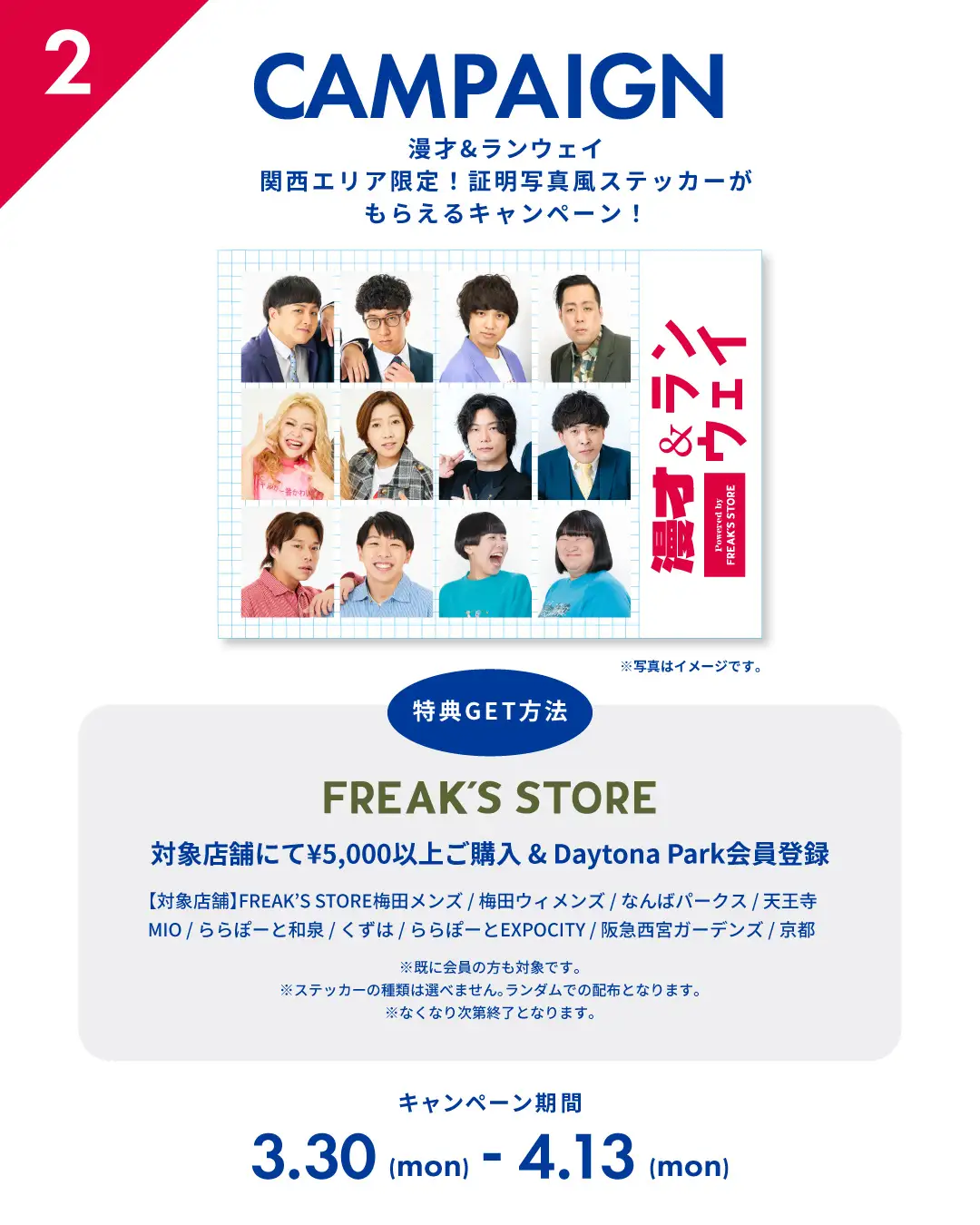 また、イベントを開催を記念し、FREAK’S STORE公式オンラインストア「Daytona Park(デイトナパーク)」内ではエバース&ヨネダ2000のサイン入りアイテムが当たるキャンペーンや、 FREAK’S STORE関西エリアの店舗では出演芸人の証明写真風ステッカー(全7種)がもらえるキャンペーンを実施します。