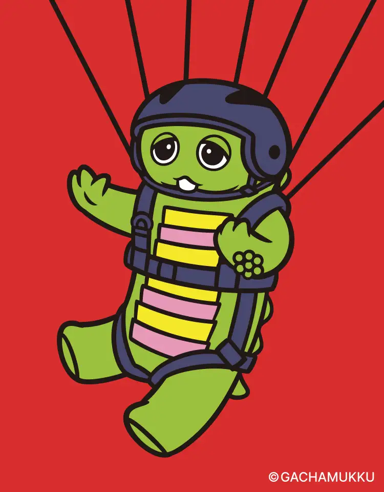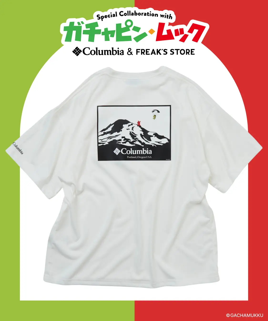 ガチャピン・ムックがあの有名なコロンビアのバックプリントでハイキングやパラシュートをして楽しむグラフィック。