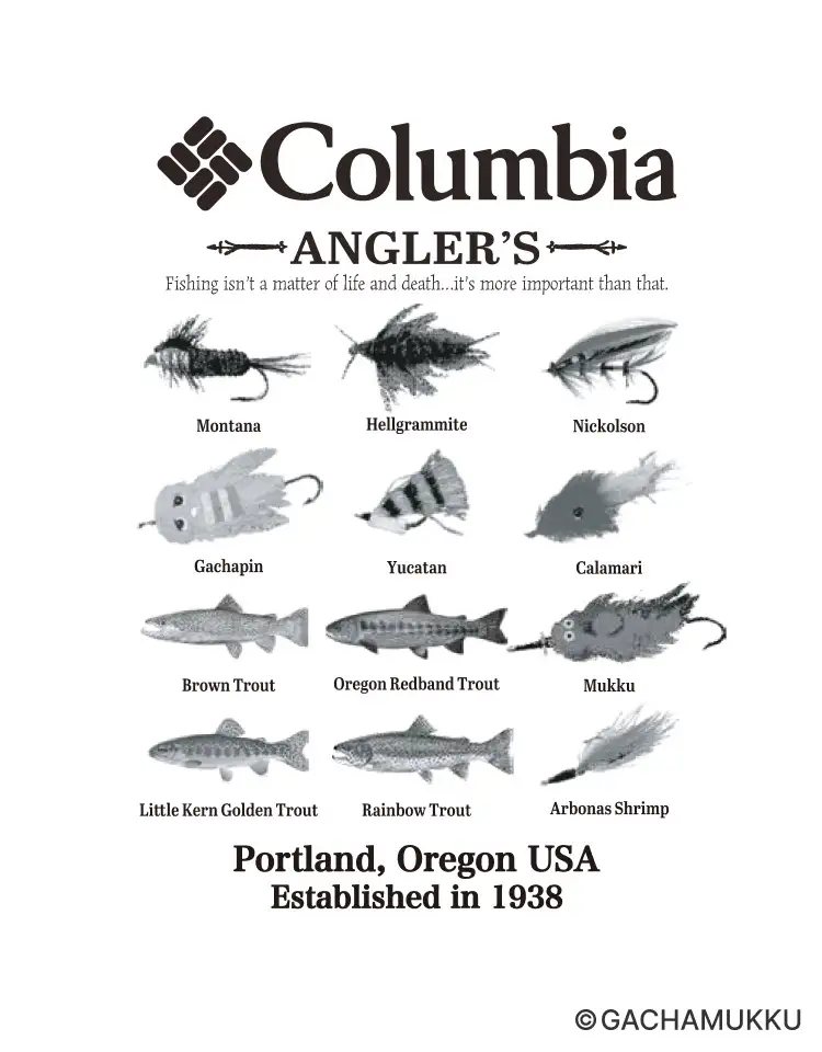 ブランドを象徴するルアーが整然と並ぶグラフィックの中に、ひっそりと紛れ込むガチャピン・ムックの姿や、ハイキングやパラシュートを楽しむ愛らしいシーンが描かれ、アウトドアの世界観とキャラクターの魅力がマッチした仕上がりに!