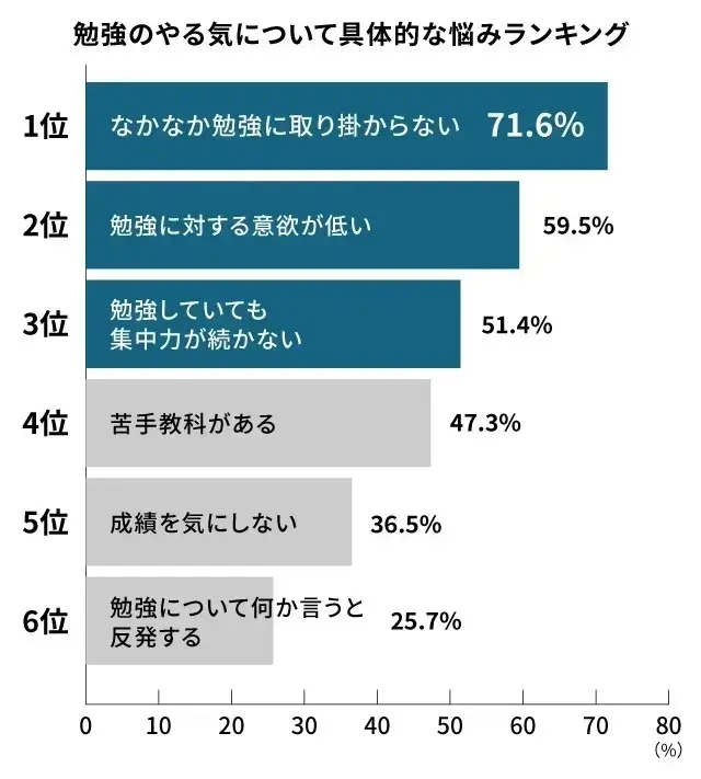 勉強のやる気について、保護者が抱えている具体的な悩みを複数回答形式で尋ねたところ、最も多かった悩みは、「なかなか勉強に取り掛からない」で71.6%でした。