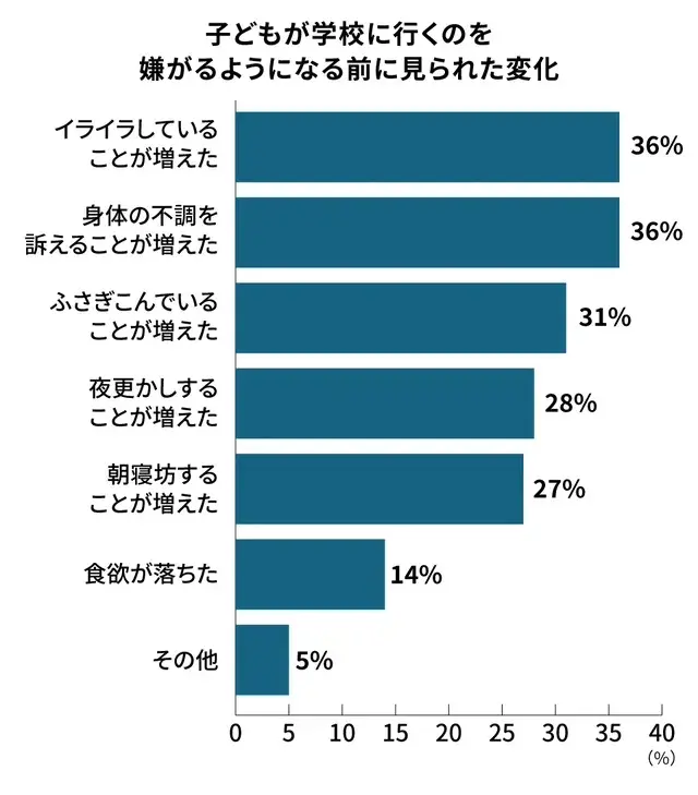 不登校の前兆として保護者が最も多く感じたのは、「イライラしていることが増えた」(36%)と「身体の不調を訴えることが増えた」(36%)という結果でした。
