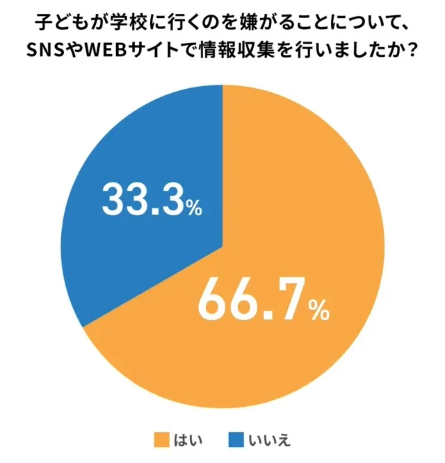 子どもが学校に行きたがらない状況に直面した保護者のうち、インターネットで情報収集をしている割合は66.7%でした。多くの保護者が、対応策を探すためにWEBサイトやSNSを活用していました。