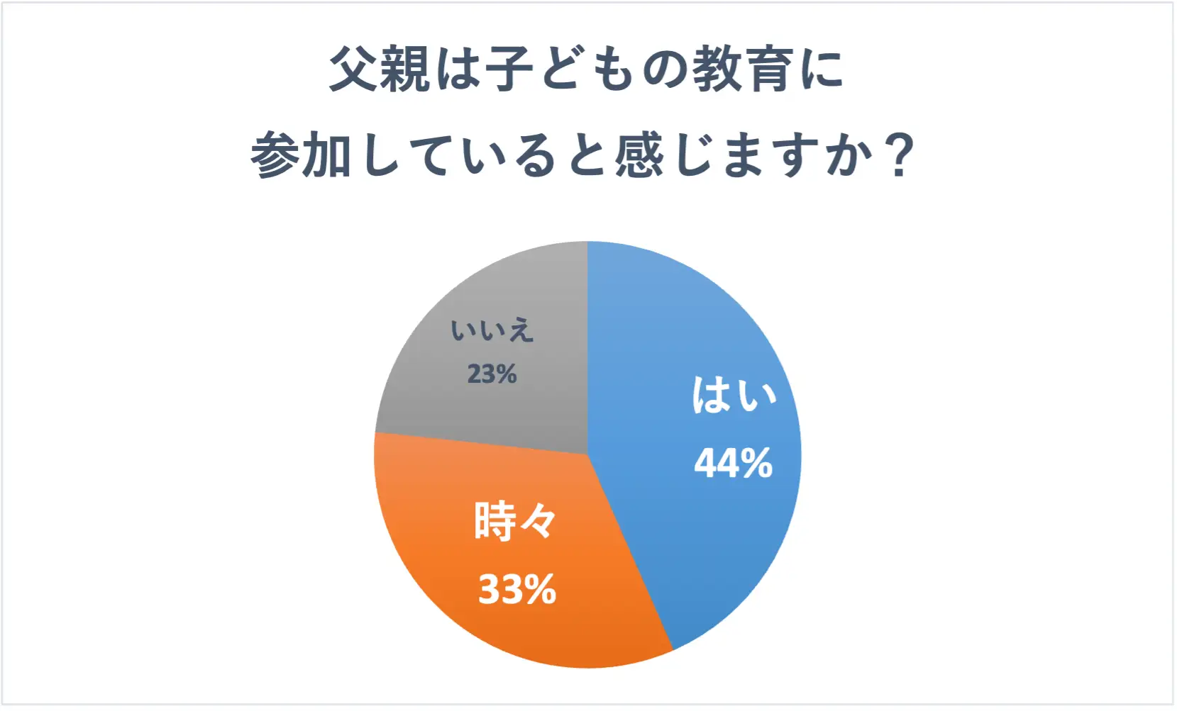 最近では、父親も子どもの教育に積極的に関わる姿勢が一般的になりつつあります。実際、44%の人が「はい」と答え、33%の人が「時々」と回答しています。一方で、依然として23%の人が「いいえ」と答えており、すべての家庭で十分な関与が実現しているわけではないことも浮き彫りになりました。