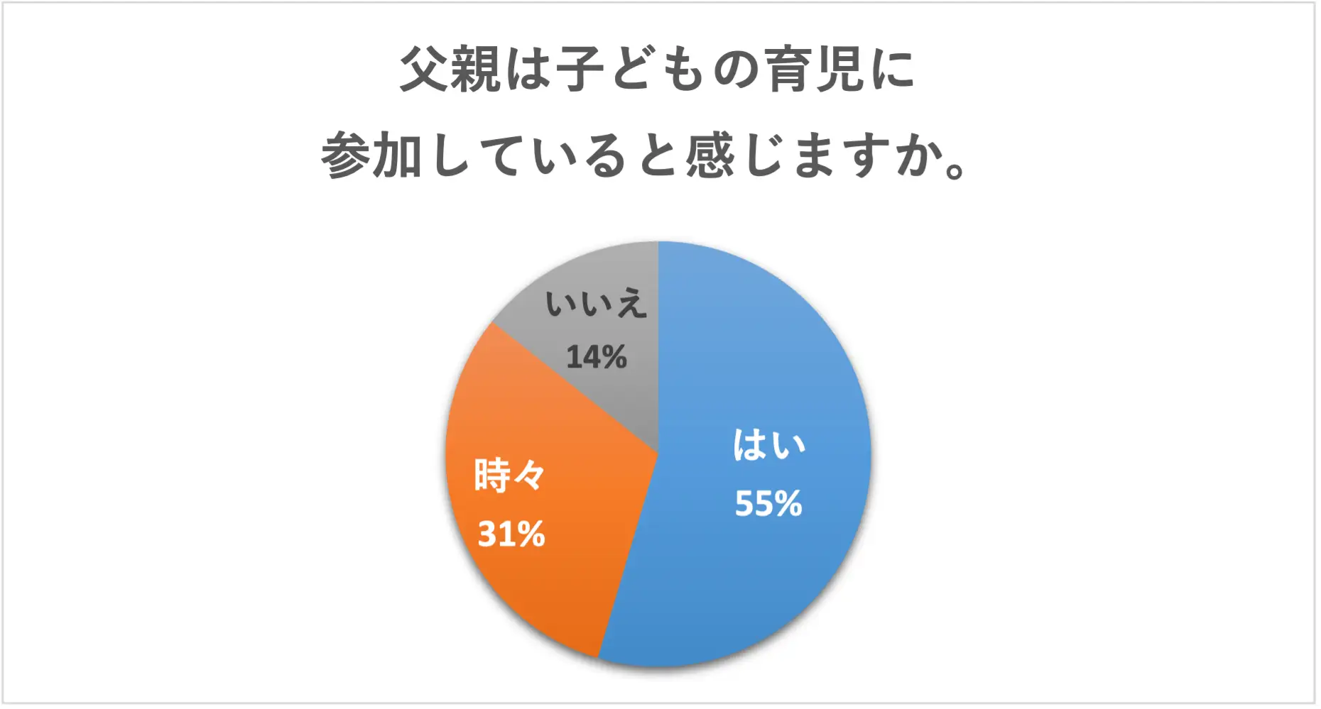 31%が「時々」、14%が「いいえ」と回答していることから、まだまだ父親の育児参加には濃淡があることも見て取れます。つまり「参加している父親」と「参加が不十分な父親」が共存している現状が浮かび上がります。