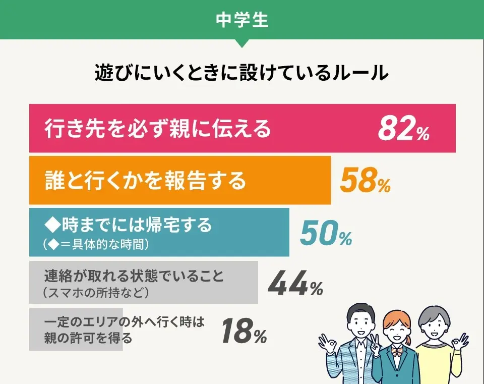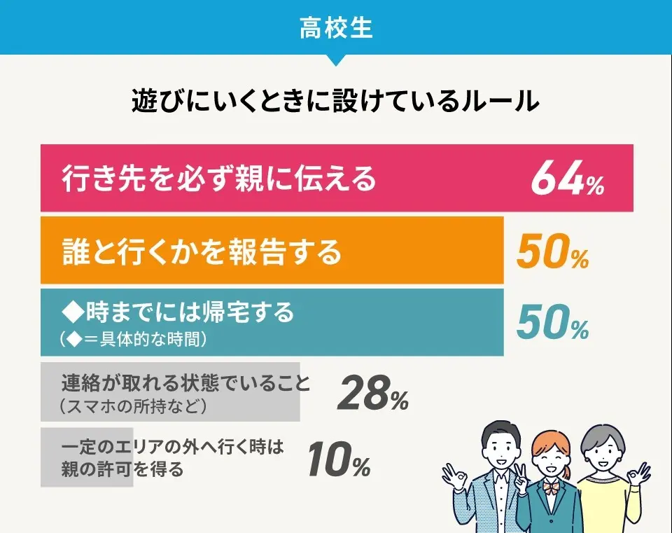 中高生になると部活動や習い事の帰宅時間だけではなく、休日に友達と遊びに行ったときの帰宅時間も遅くなりがちです。いわゆる門限と呼ばれる子どもが自由に過ごしている日の帰宅時間についてルールを設けているかを聞いたところ、中学生では7割以上、高校生でも6割以上がルールを設けていることがわかりました。