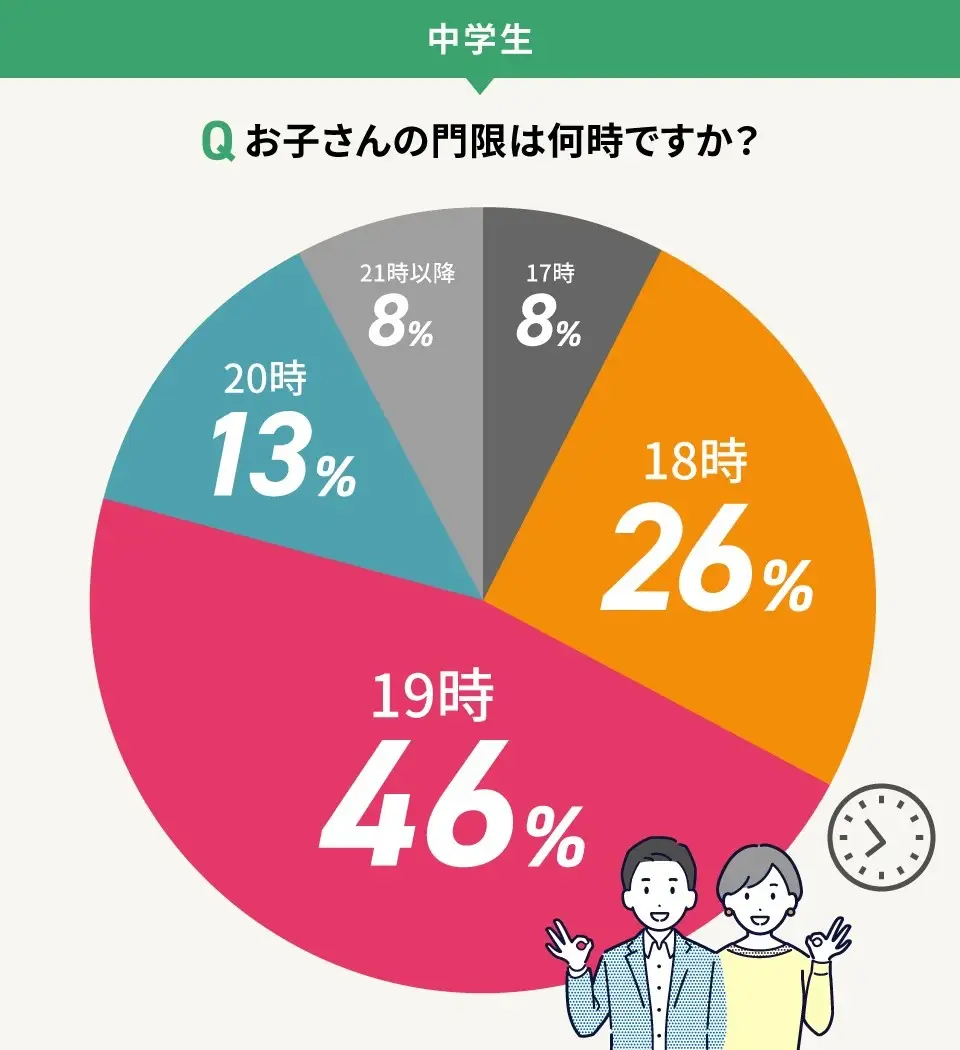 帰宅時間に関するルールを設けていると答えた家庭に、実際に何時を門限としているかも聞きました。その結果、中学生では約半数が19時、高校性では20時が一番多い回答を集めました。年齢や子どもの生活の変化によって各家庭で時間を調節しているようです。