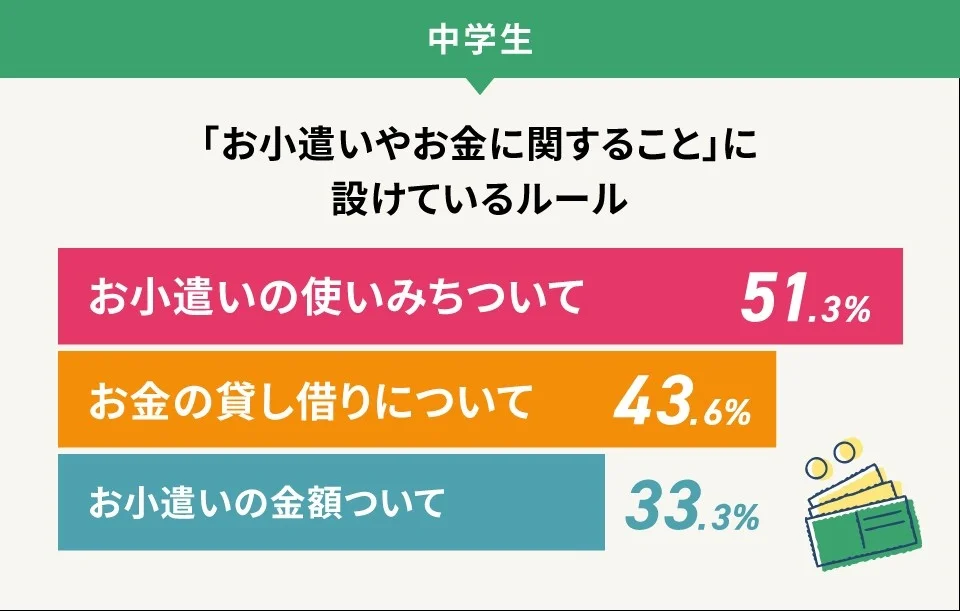お小遣いやお金に関するルールを設けることも、親子間で重要な約束ごとの一つです。中学生・高校生ともに、何にお金を使うのかを親子で話し合い、使い方にルールを設けることで、子どもが金銭感覚を学ぶ手助けになります。