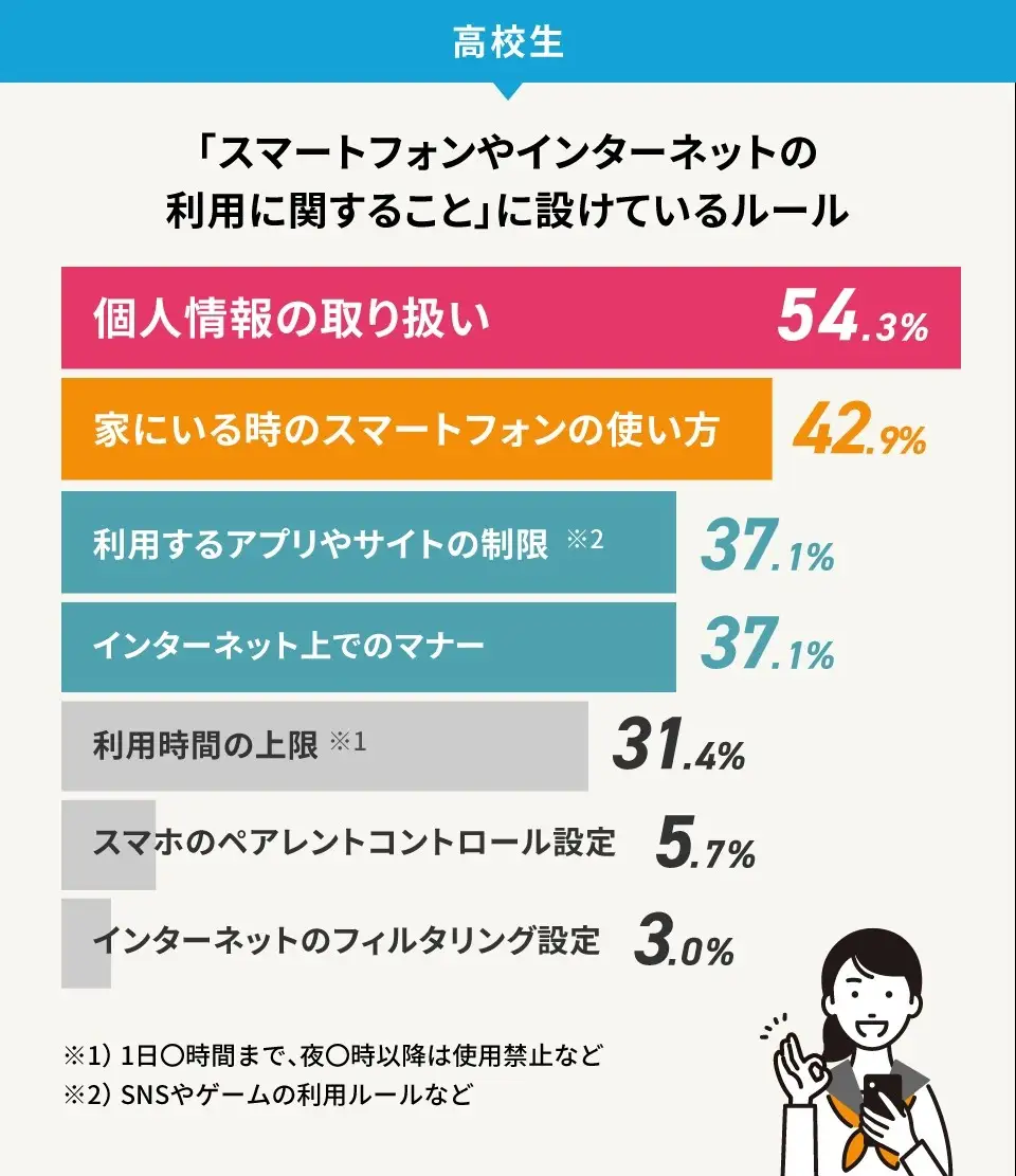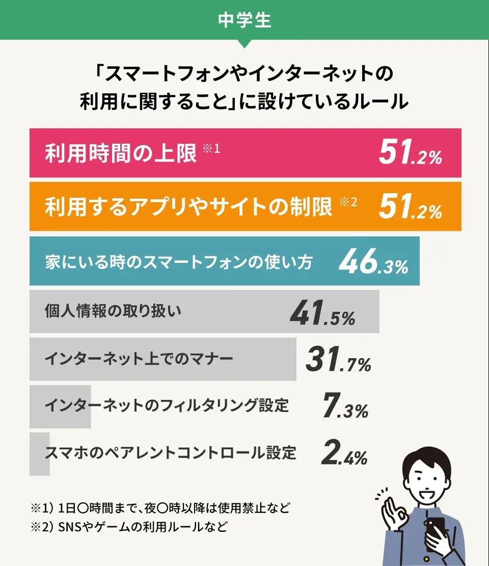 その結果、中学生のいる家庭では「利用時間を制限している」「寝室に持ち込まないようにしている」といった比較的厳しめのルールを設けている傾向が見られました。