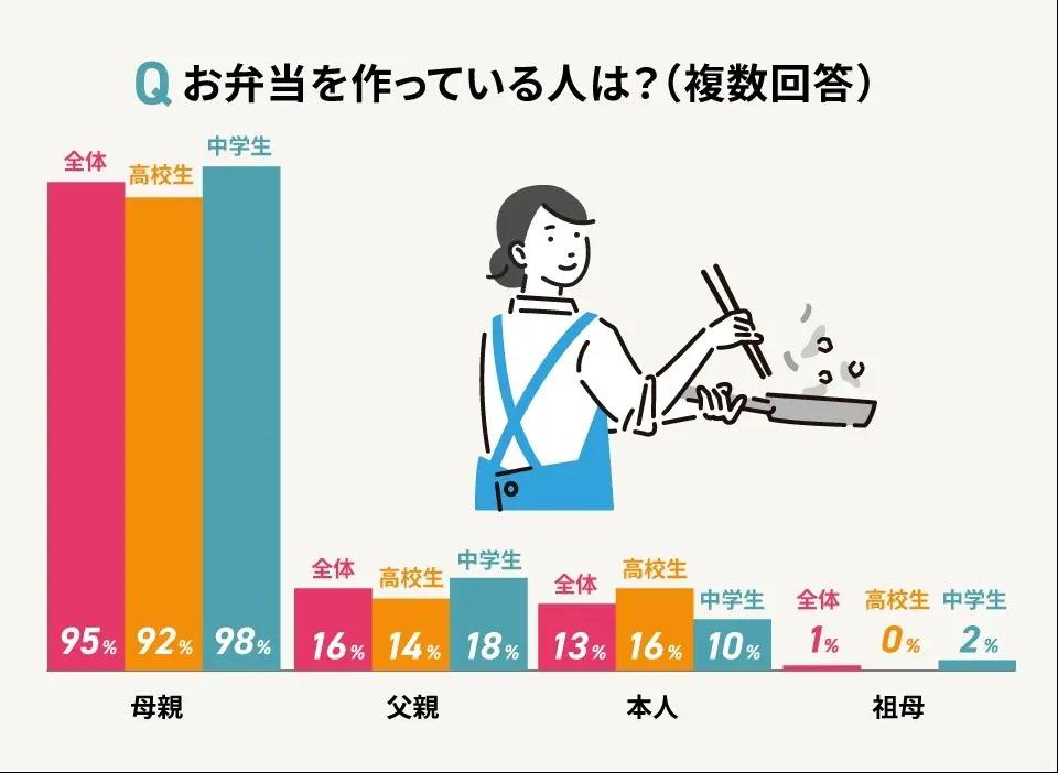 アンケートでお弁当を作っている人は誰なのかを質問しましたところ、自分でお弁当を作っている子どもは中学生で10%、高校生で16%という結果となりました。子どもが自分で作る割合は高校生になるとやや増えていますが、95%の家庭では母親が作っているようです。