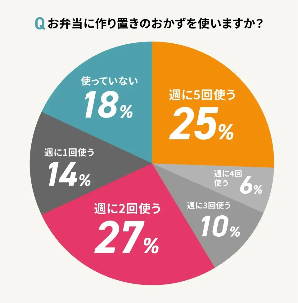 また、作り置きや冷凍食品のおかずを入れる割合についても質問しました。その結果、当日作るおかずが全体の40%、冷凍食品と作り置きのおかずがそれぞれ30%という意見が最も多く集まりました。