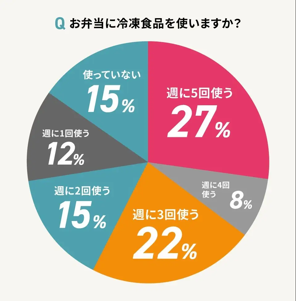 お弁当に作り置きのおかずや冷凍食品を使う家庭も多く、忙しい朝の味方として活用されているようです。近年では保冷剤代わりに凍ったまま入れられるものなど、冷凍食品も進化しています。味のクオリティも年々高くなっているため、冷凍食品を週3日以上使っている家庭も半数を超える結果となりました。使っていない家庭は全体の15%と低く、多くの家庭で冷凍食品が活用されていることが分かります。