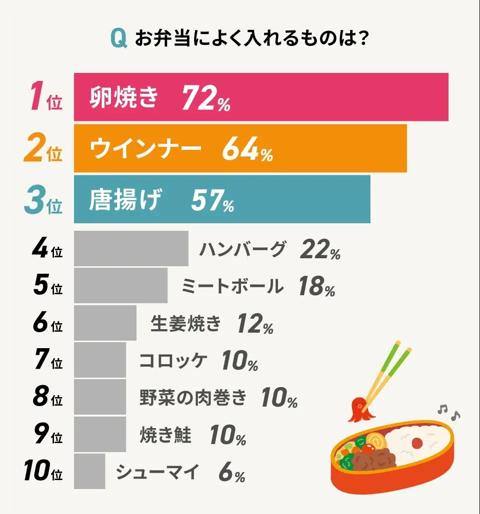 定番メニューが決まっていると、お弁当作りにすぐにとりかかることができます。今回のアンケートでは、お弁当のおかずによく入れるものについても質問しました。その結果、栄養が高く、彩りもきれいで、どんなおかずとも相性の良い卵焼きが圧倒的に人気でした。ウインナーや唐揚げなど腹持ちがよく、子どもが好きなメニューも上位に入っています。