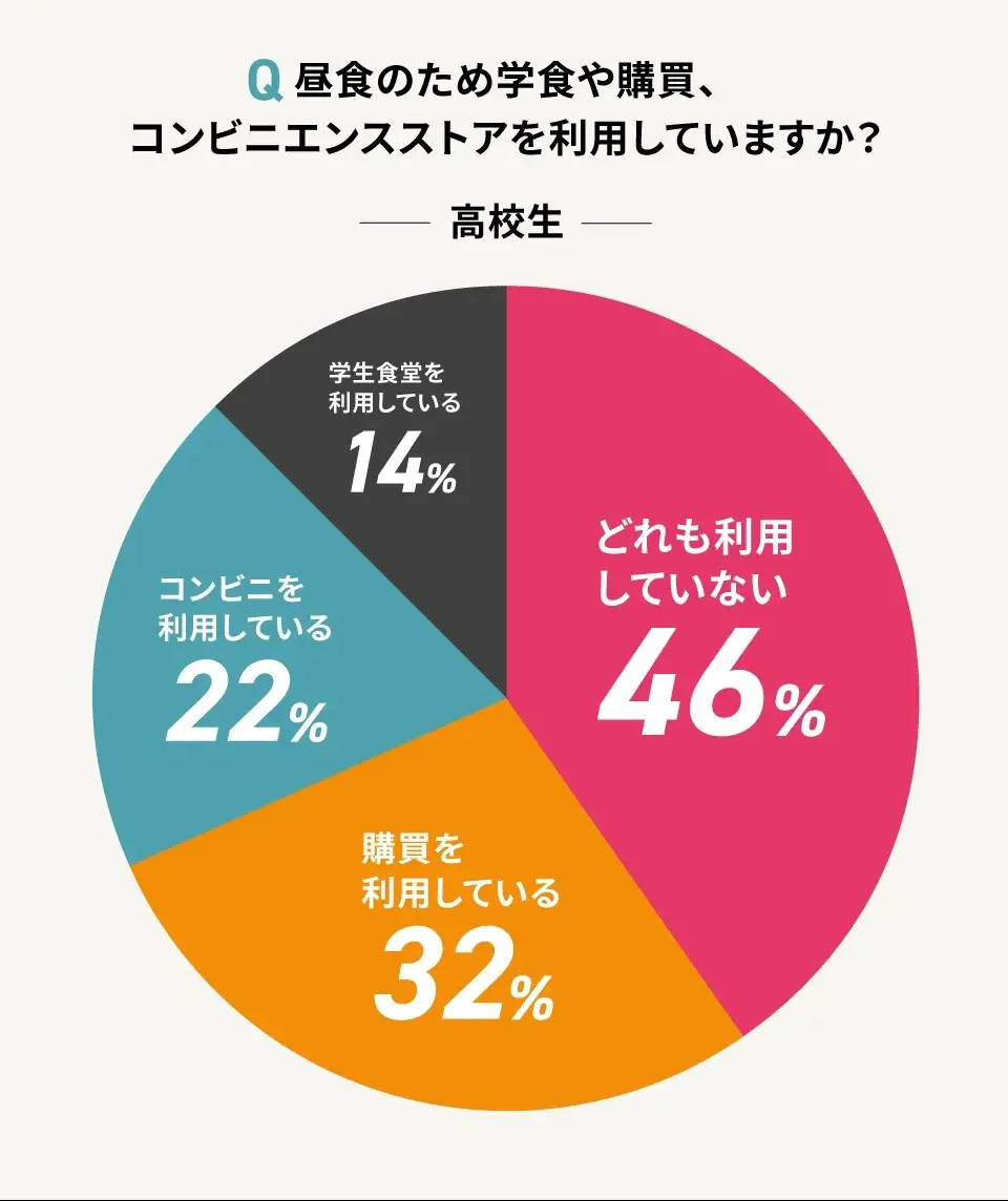 高校生でもお昼に学食や購買を利用していると答えた方は半数にとどまり、お弁当を持参することが基本となっているようです。