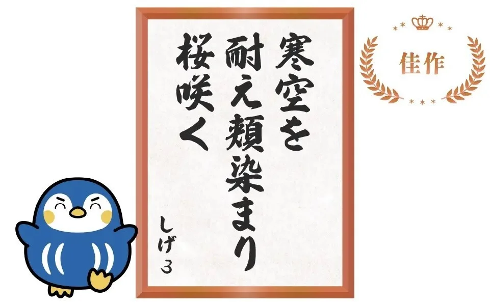 受験期の厳しさとその先に訪れる喜びを、自然の移り変わりと重ね合わせた美しさがありました。「寒空を耐え」は冬の厳しい試練を象徴し、それに立ち向かう姿、「頬染まり」には寒さを耐える中での緊張感や期待感、さらには合格の喜びに頬を紅潮させる様子が浮かびます。最後の「桜咲く」に春の訪れと合格の象徴が表現されており、受験生の励みになる素敵な川柳でした。