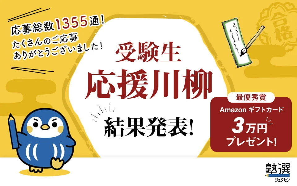 今回は志望校合格を目指して頑張る受験生のみなさんを応援するために、「受験生応援川柳」の募集を行いました。応募総数は1,355句に上り、全国から受験生に向けた温かい作品が寄せられました。
