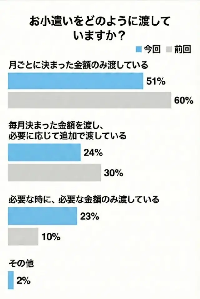 ただし、この割合は前回調査(60%)から減少、「必要なときに必要な金額のみ」(23%)という柔軟な渡し方が増えていました