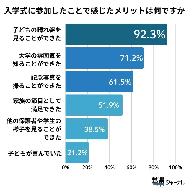 入学式に参加して良かった点を尋ねたところ、最も多かったのは「子どもの晴れ姿を見ることができた」(92.3%)でした。「大学の雰囲気を知ることができた」(71.2%)、「記念写真を撮ることができた」(61.5%)、「家族の節目として満足できた」(51.9%)と続きました。