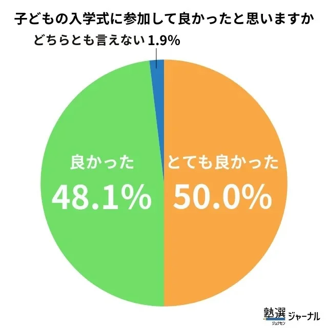 入学式に参加した保護者に対し、満足度を5段階で尋ねました。「とても良かった」「良かった」と回答した人を合わせると約98%と満足度は非常に高いことがわかりました。