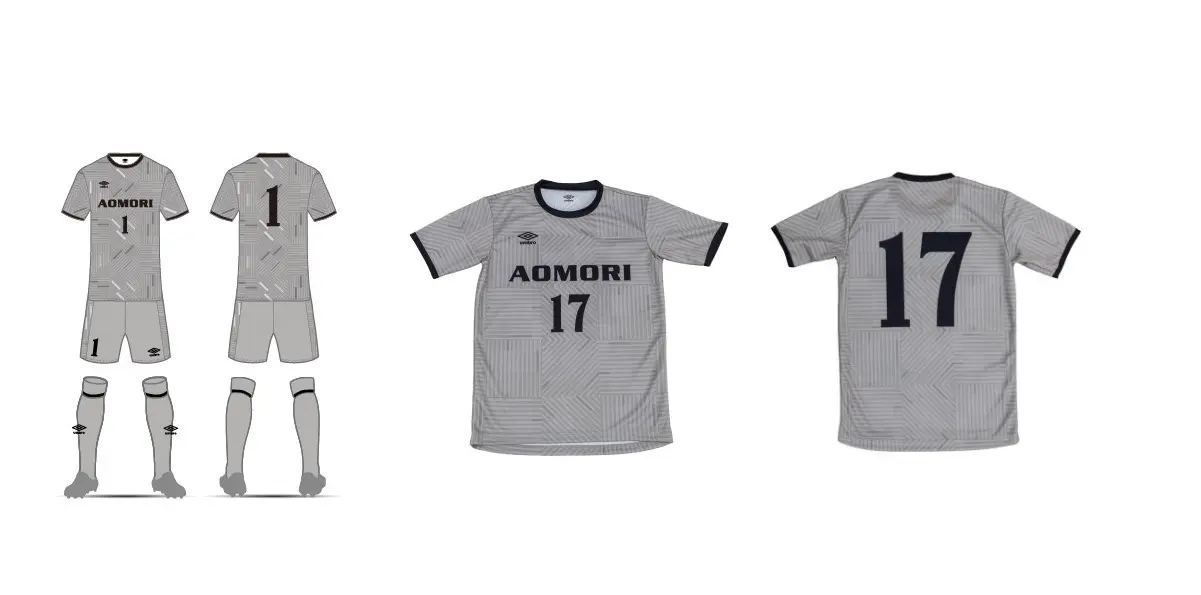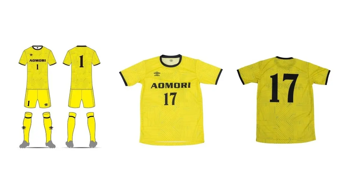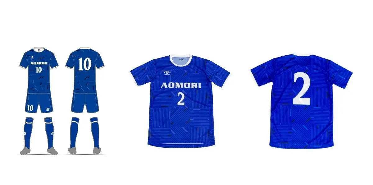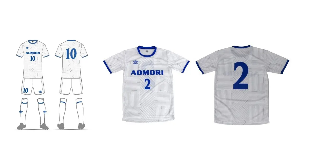 青森の伝統工芸の一つである「南部裂織(なんぶさきおり)」をモチーフに、青森県の伝統と『アンブロ』のオリジナリティが融合した特別なデザインです。フィールドプレーヤーのユニフォームは、青森の澄んだ空と海をイメージしたブルーを基調とし、クリーンなデザインに仕上げています。